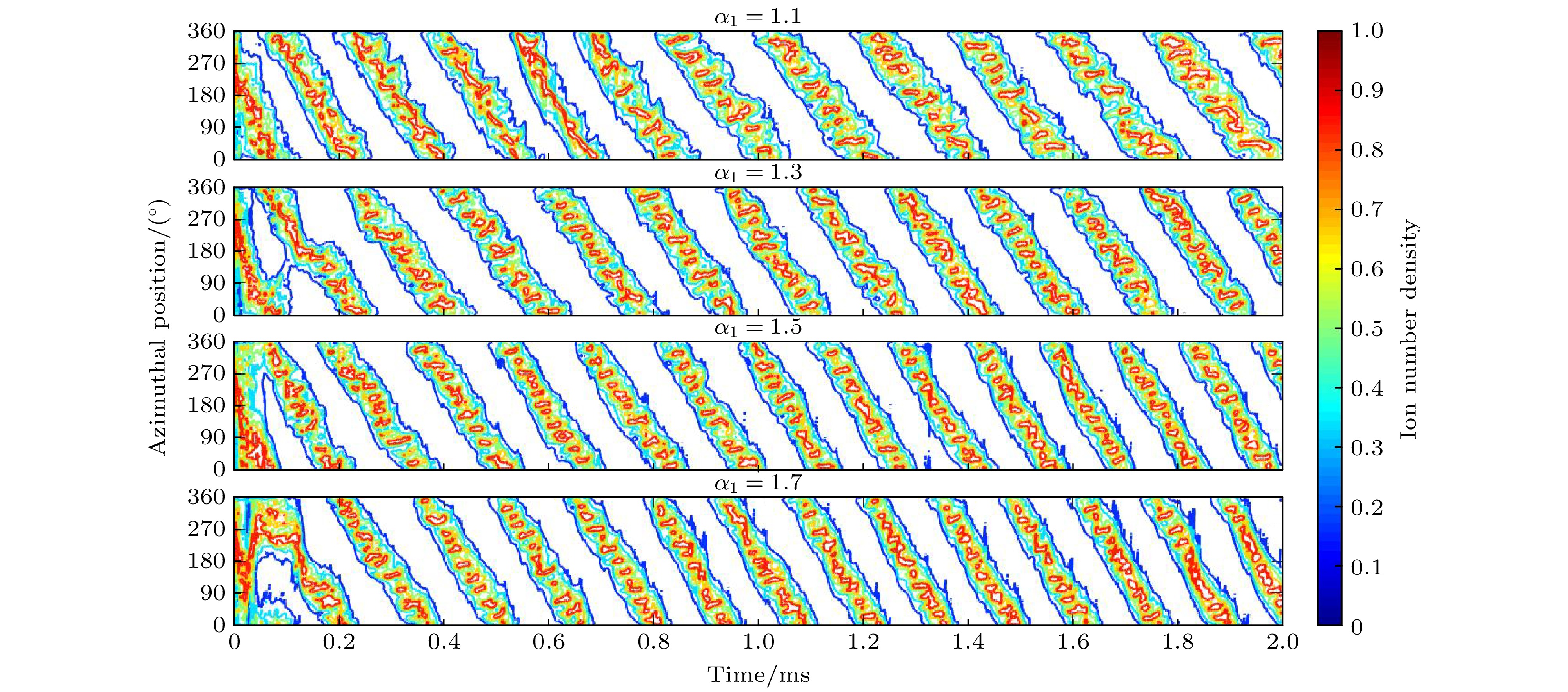 图 2 ${\alpha _1} = 1.1$时离子数密度(a)、电离率(b)、中性原子数密度(c)、电势(d)、轴向电场(e), 角向电场(f)在一个周期内不同时刻的分布