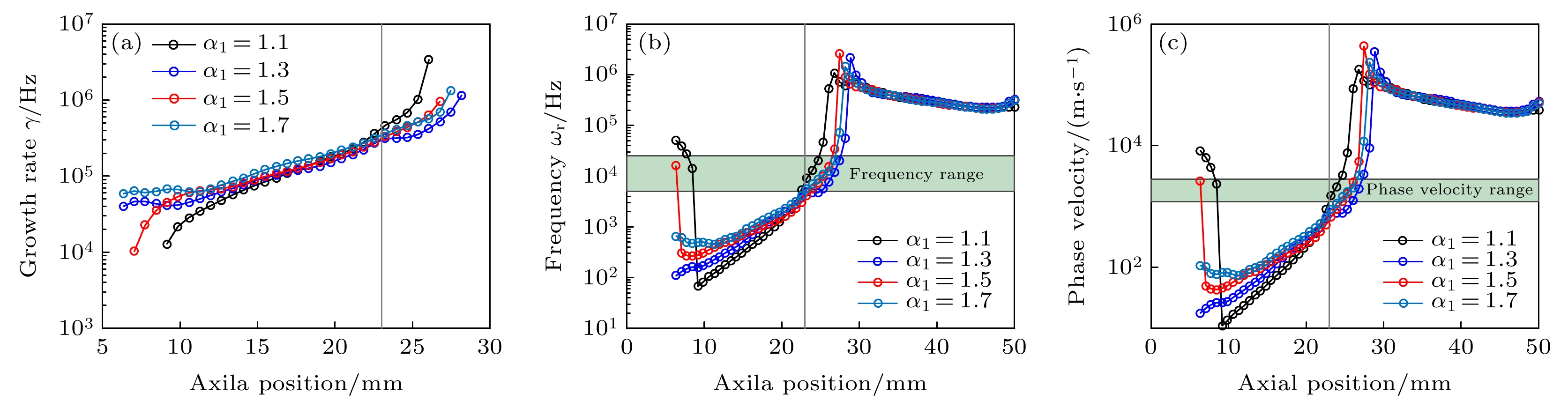 Figure 6. The instability growth rate (a), frequency (b), and phase velocity (c) induced by density and magnetic gradient. The shaded area in (b), (c), are the typical spoke frequency and phase velocity, range from 5–25 kHz and 1200–2800 m/s, respectively.