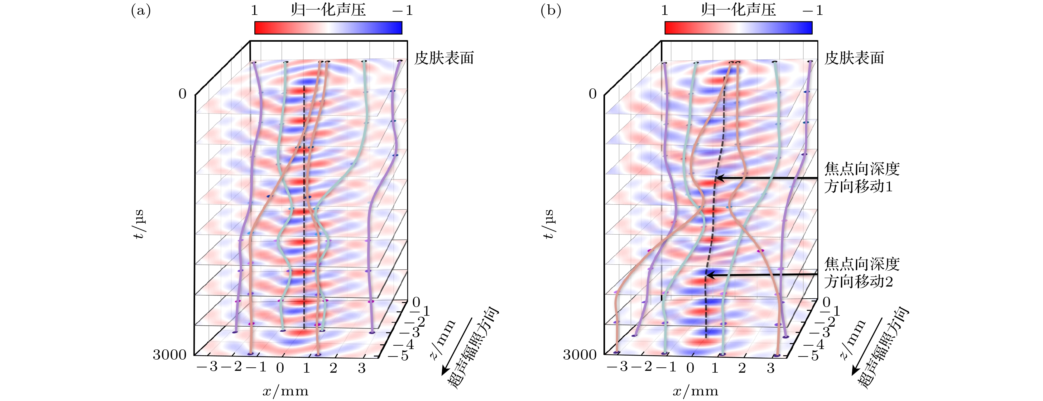 图 9 三种典型位置粒子在两种声场中的三维运动路径(对应粉、绿、紫曲线), 其中黑色虚线描绘了声场焦点中心的变化 (a)固定焦点聚焦声场; (b)动态移焦声场