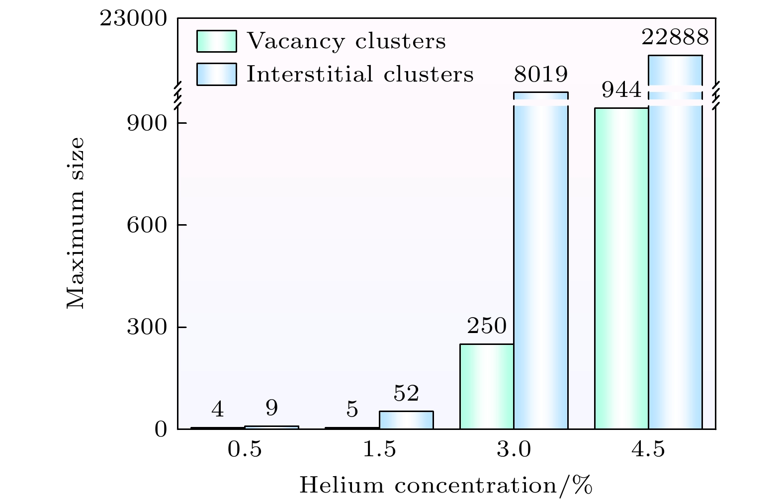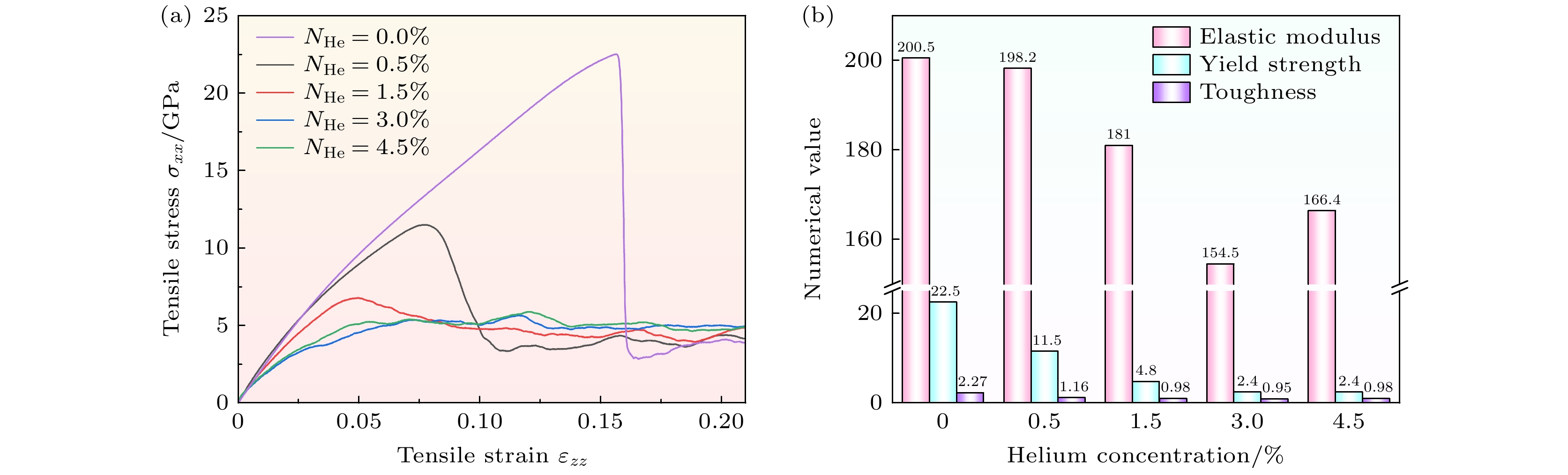 Understanding the intrinsic correlation between helium concentration and the evolution of defects as well as mechanical properties in low-activation steel on an atomic scale is crucial for designing fusion materials with excellent resistance to swelling and embrittlement. This study investigates the effect of helium concentration on single-crystal iron through molecular dynamics simulations, thereby clarifying the mechanisms by which helium concentration affects helium defect evolution, mechanical properties, and plastic deformation behavior of low-activation steel on an atomic scale. Models of body-centered cubic (BCC) iron with different helium concentrations (0.5%—4.5%) are established. Wigner-Seitz cell analysis and cluster clustering methods are employed to track the evolution of Frenkel Pairs (FPs) and cluster defects, revealing the mechanism of helium concentration-induced FPs and cluster formation at 500 ℃. Furthermore, combined with tensile mechanical simulations, the effects of helium behavior on the mechanical properties of single-crystal iron, such as elastic modulus, yield strength, and toughness, are analyzed, and the correlation mechanisms between helium concentration-induced defect evolution, mechanical properties, and plastic deformation behavior are revealed. The results show that when NHe < 3.0%, the number of FPs linearly reaches to a peak and then stabilizes. This is because helium behavior causes a rapid increase in the number of FPs and a large number of interstitial atoms are generated, some of which recombine. The annihilation rate of FPs increases with their number increasing and eventually equals the generation rate, resulting in a stable number of FPs. When NHe ≥ 3.0%, the initial increase and stabilization are the same as those for NHe < 3.0%. However, after the formation of large interstitial clusters, they absorb interstitial atoms and grow, hindering recombination and reducing the annihilation rate of FPs, thus leading to a secondary increase. The large clusters are surrounded by vacancies and no longer hinder FP recombination, and a new balance is achieved, resulting in a secondary stabilization of the FP number. When NHe increases to 3.0%, the elastic modulus, yield strength, and toughness of single-crystal iron decrease by 21%, 88%, and 57%, respectively; beyond this concentration, the mechanical properties no longer decrease. This is because when NHe < 3.0%, as helium concentration increases, helium-induced defects increase, leading to a decrease in toughness and promoting dislocation nucleation, thus reducing the elastic modulus and yield strength. When NHe ≥ 3.0%, dislocations exist in the initial defects, and the number of clusters changes slightly; toughness no longer decreases, and dislocation nucleation is not affected, leading to the stabilization of elastic modulus and yield strength. At NHe = 3.0%, the formation of large clusters hinders the movement of slip systems, changes the orientation of slip planes, weakens the effectiveness of the main slip system, which leads to an increase in small slip bands and causes the plastic deformation mechanism to transform from cross-slip to decomposition into discrete dislocations and point defects once the slip bands intersect with each other. This study reveals the influence patterns and key mechanisms of helium concentration on defect evolution and mechanical properties of single-crystal iron, providing a theoretical basis for designing fusion iron-based materials.