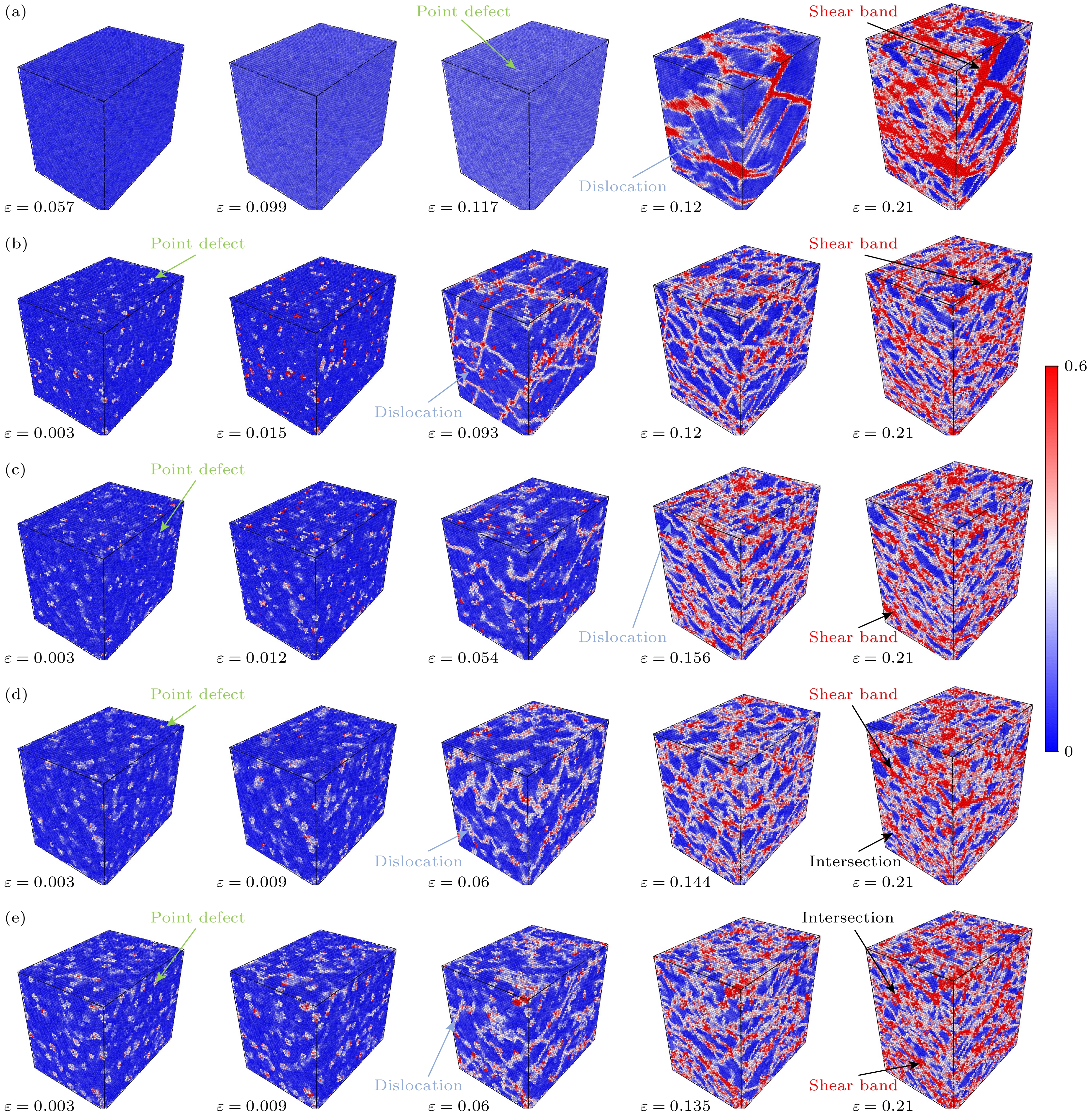 Figure 11. Atomic configuration evolution of single-crystal iron with 1.5% helium concentration during tensile deformation: (a) ε = 0; (b) ε = 0.024; (c) ε = 0.06; (d) ε = 0.096; (e) ε = 0.126; (f) ε = 0.15; (g) ε = 0.174; (h) ε = 0.21.