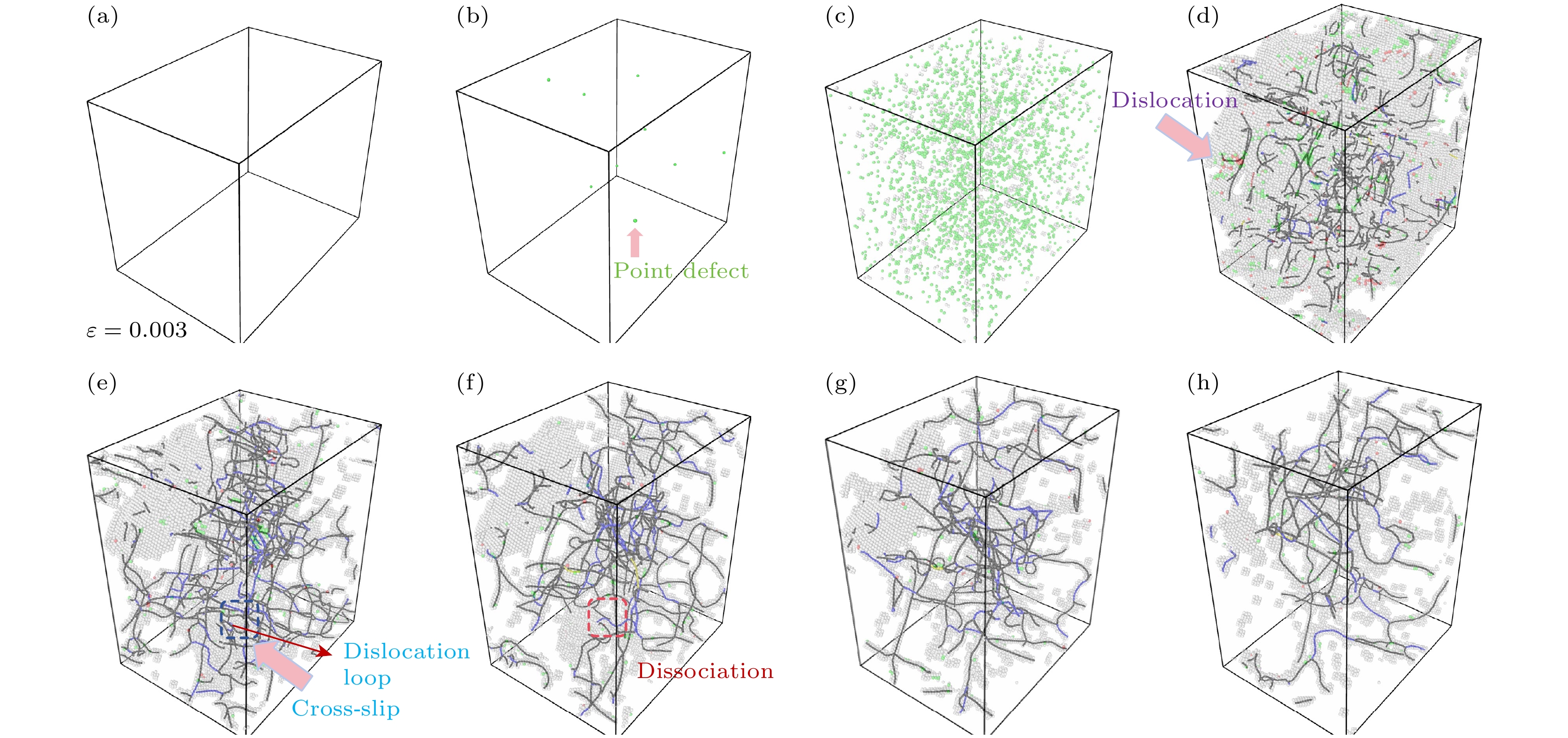 Figure 9. Atomic configuration evolution of single-crystal iron without helium concentration effect during tensile deformation: (a) ε = 0.003; (b) ε = 0.054; (c) ε = 0.108; (d) ε = 0.12; (e) ε = 0.135; (f) ε = 0.165; (g) ε = 0.189; (h) ε = 0.21; gray-white atoms denote “other”, green denotes “fcc”; lines are dislocation lines, black denotes “1/2$ \left\langle {111} \right\rangle $”, blue denotes “$ \left\langle {100} \right\rangle $”, and yellow denotes “$ \left\langle {110} \right\rangle $”.