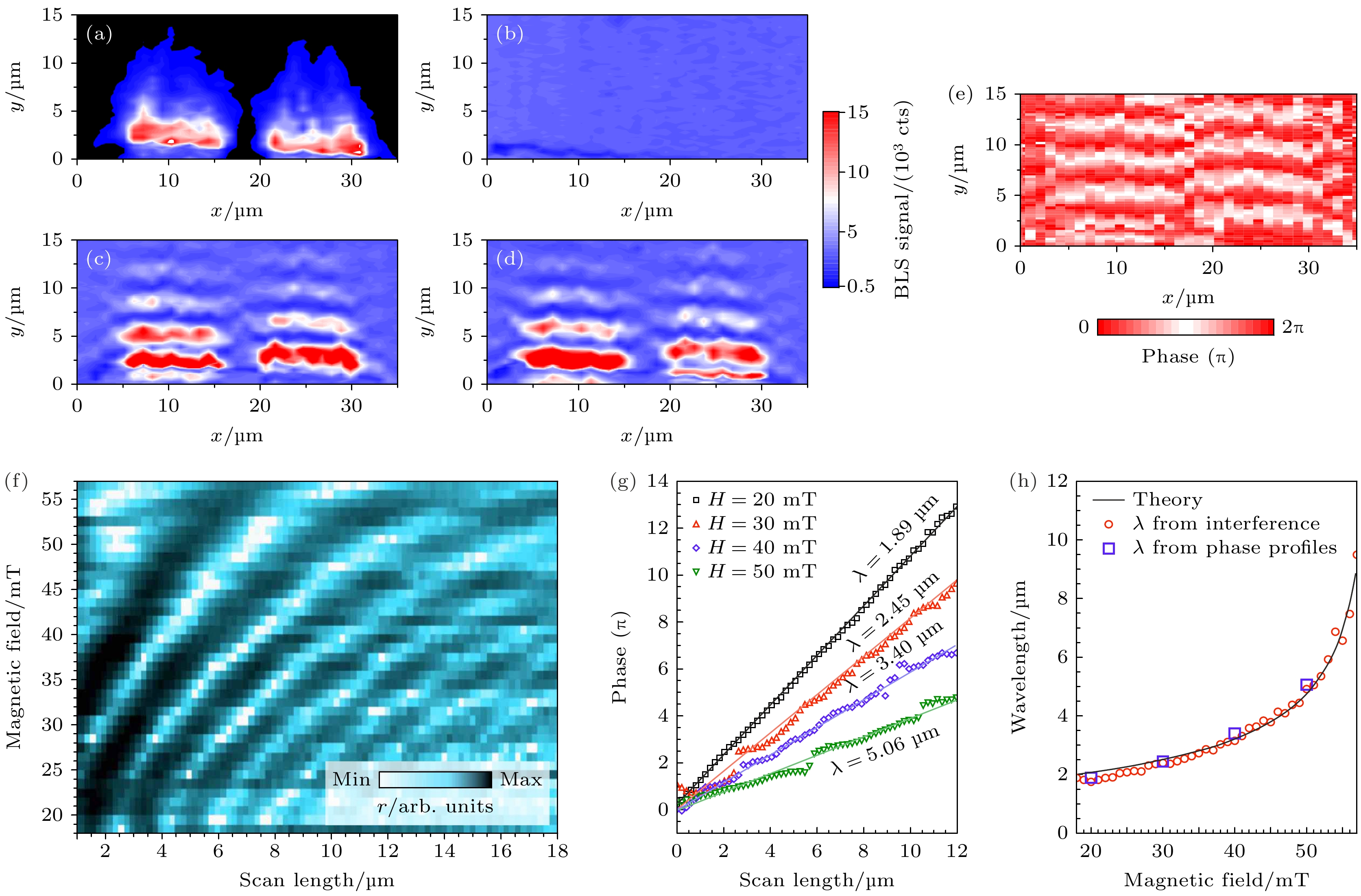图 10 相位分辨BLS测量示例 (a)—(d) 完整重构自旋波相位所需的四次测量[56], 其中(a)为自旋波强度测量(EOM关闭), 结果显示自旋波仅在靠近天线的部分被激发; (b) 为EOM信号强度测量(自旋波激发关闭), 其信号与样品反射率成正比(对于薄膜, 此反射率是恒定的); (c)和(d) 为两个干涉图样(自旋波与EOM信号同时开启), 相对相移为$ \pi/2 $; (e) 从(a)—(d)的测量中重构的相位[56]; (f) 对于2.5 μm×100 μm、厚度40 nm的坡莫合金条, 测量的干涉信号随扫描长度和外部磁场的变化, 黑色(白色)区域代表相长(相消)干涉的位置[59]; (g) 在选定磁场下自旋波相位的完整重构[59]; (h) 激发自旋波的波长随外加磁场的变化[59], 实线表示计算所得的色散关系, 红色圆圈表示从(f)中干涉图样提取的结果, 蓝色方框表示从(f)中相位分布获得的结果