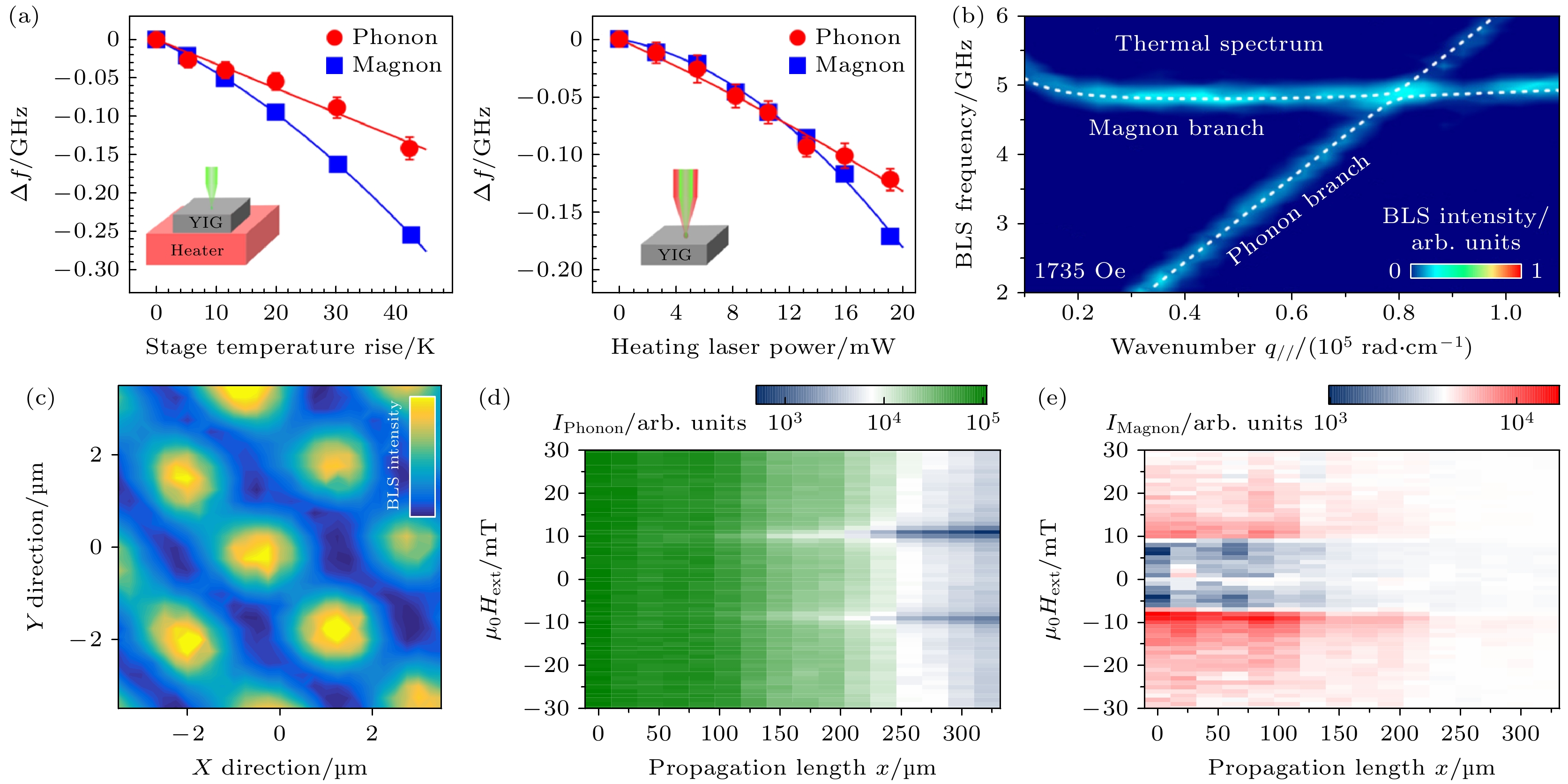 Figure 11. Applications of Brillouin light scattering in phonon and magnetoacoustic coupling studies. (a) Thermal response of magnon and phonon peak frequencies in a magnetic insulator: The left panel shows phonon data fitted linearly (red line) and magnon data fitted quadratically (blue line) as a function of sample stage temperature; the right panel shows data fitted polynomially as a function of heating laser power with the sample stage at room temperature. Together, they reveal the distinct thermal response characteristics of the two quasiparticles[71]. (b) Thermal magnon-phonon BLS spectra in YIG, showcasing thermally excited magnon and phonon peaks, providing a reference for studying magnon-phonon interactions[62]. (c) BLS imaging study of phonon dynamics: Real-time visualization of surface acoustic waves is achieved through inelastic scattering of photons and phonons, with the figure illustrating the formation process of two-dimensional standing wave modes[20]. (d)–(e) In magnetoacoustic coupling experiments, BLS is used to test phonon signals (d) and magnon signals (e) at different applied magnetic fields and propagation distances. Panel (d) shows the gradual formation of two intensity dips at the resonant magnetic field as the surface acoustic wave propagation distance increases, directly reflecting the progressive absorption of surface acoustic waves due to magnetoacoustic coupling[72]; panel (e) shows that magnon excitation reaches its maximum at the starting position of the ferromagnetic layer and decreases with the attenuation of the phonon amplitude, revealing the localized energy conversion process from surface acoustic waves to spin waves[72].