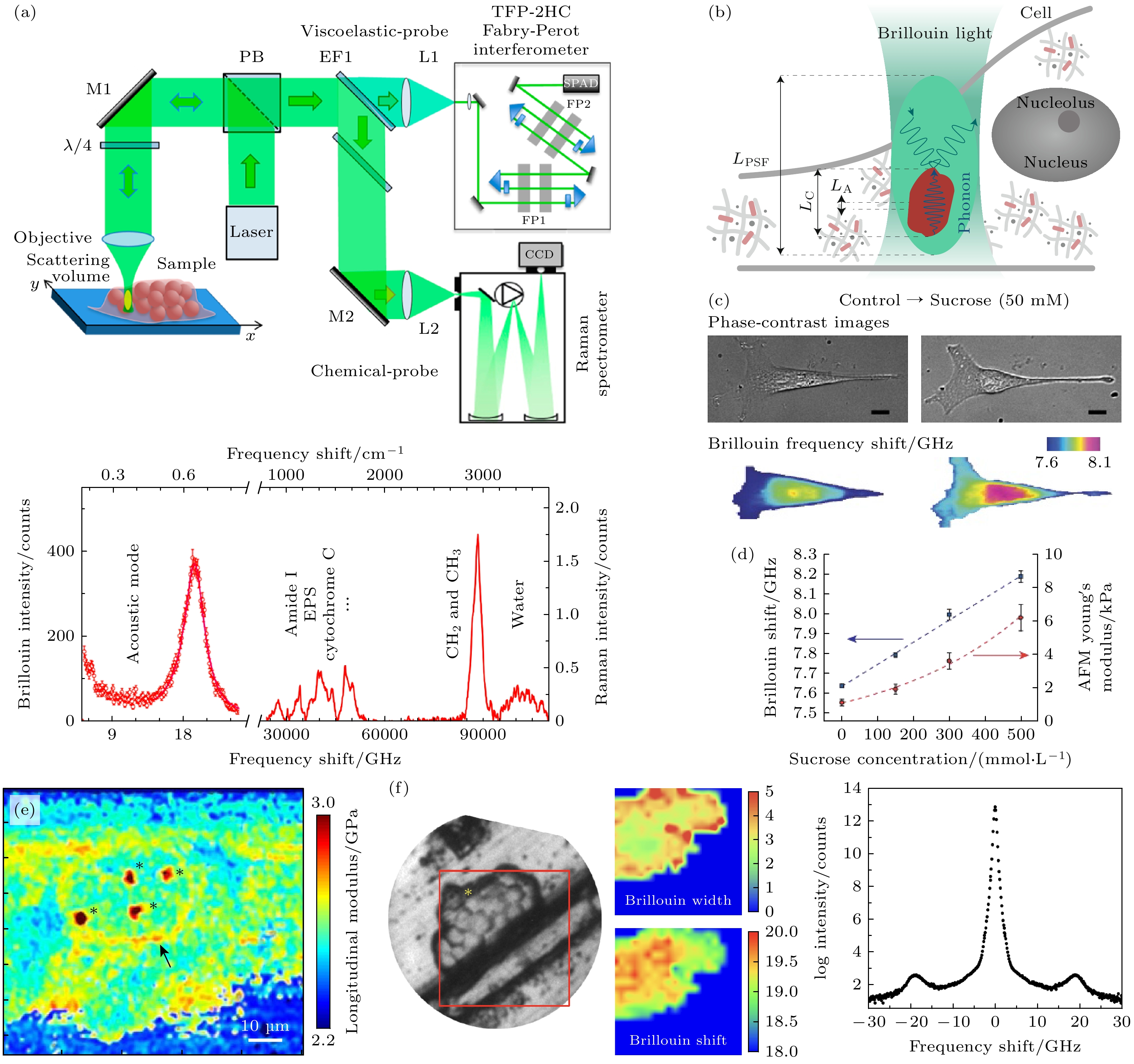 Figure 12. Applications of Brillouin light scattering in biology: (a) Miniature Brillouin-Raman microspectrometer (top) and correlated spectra acquired from the same sample location (bottom)[64]; (b) schematic of μBLS measurement illustrating three key spatial scales: acoustic Wwavelength scale $ L_\text{A} $ (200 nm, determined by incident light wavelength and sample refractive index), optical collection scale $ L_\text{PSF} $ (1–5 μm, determined by the point spread function of the microscope system), and component scale $ L_\text{C} $ (structural size with homogeneous mechanical properties in the sample)[67]; (c) Brillouin microscopy (bottom) and phase contrast microscopy (top) images of NIH 3T3 mouse embryonic fibroblasts before and after hyperosmotic shock, scale bar: 10 μm, demonstrating changes in cytoplasmic sol-gel transition[75]; (d) effect of environmental ssmotic pressure on cellular Brillouin frequency shift and AFM nanoindentation measurements, showing a linear relationship between Brillouin frequency shift and sucrose concentration[75]; (e) high-resolution Brillouin image of In Vitro cultured porcine aortic endothelial cells, clearly revealing cellular structures such as the nuclear envelope (arrows) and nucleoli (*)[76]; (f) Brillouin spectral analysis of candida albicans biofilms, including optical microscopic images, high-contrast Brillouin spectra, and frequency and linewidth distribution maps[77], red box size: 20 μm×20 μm.