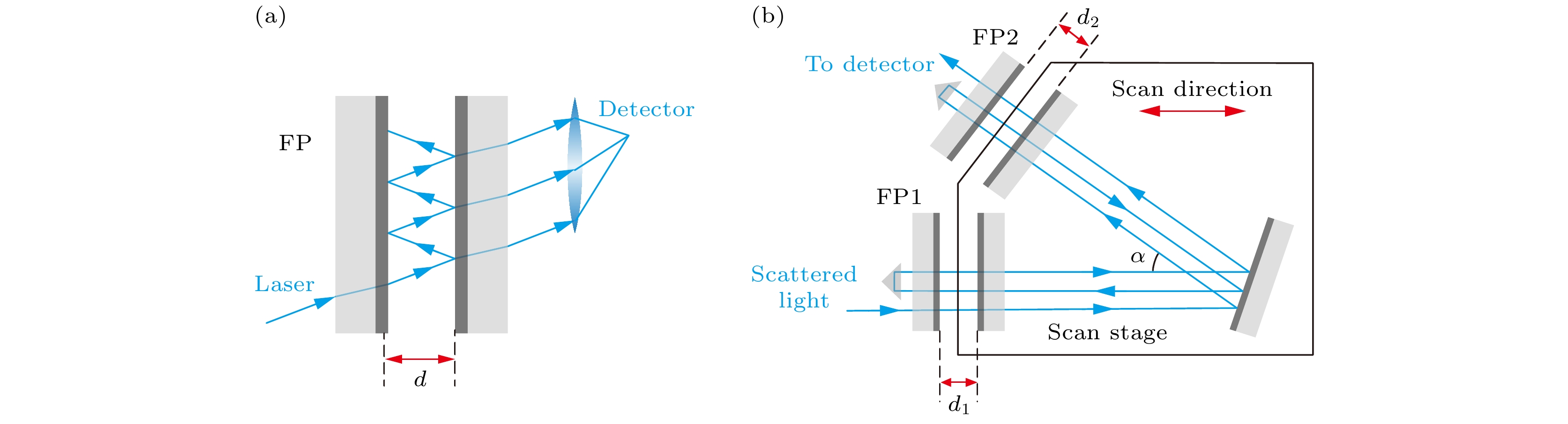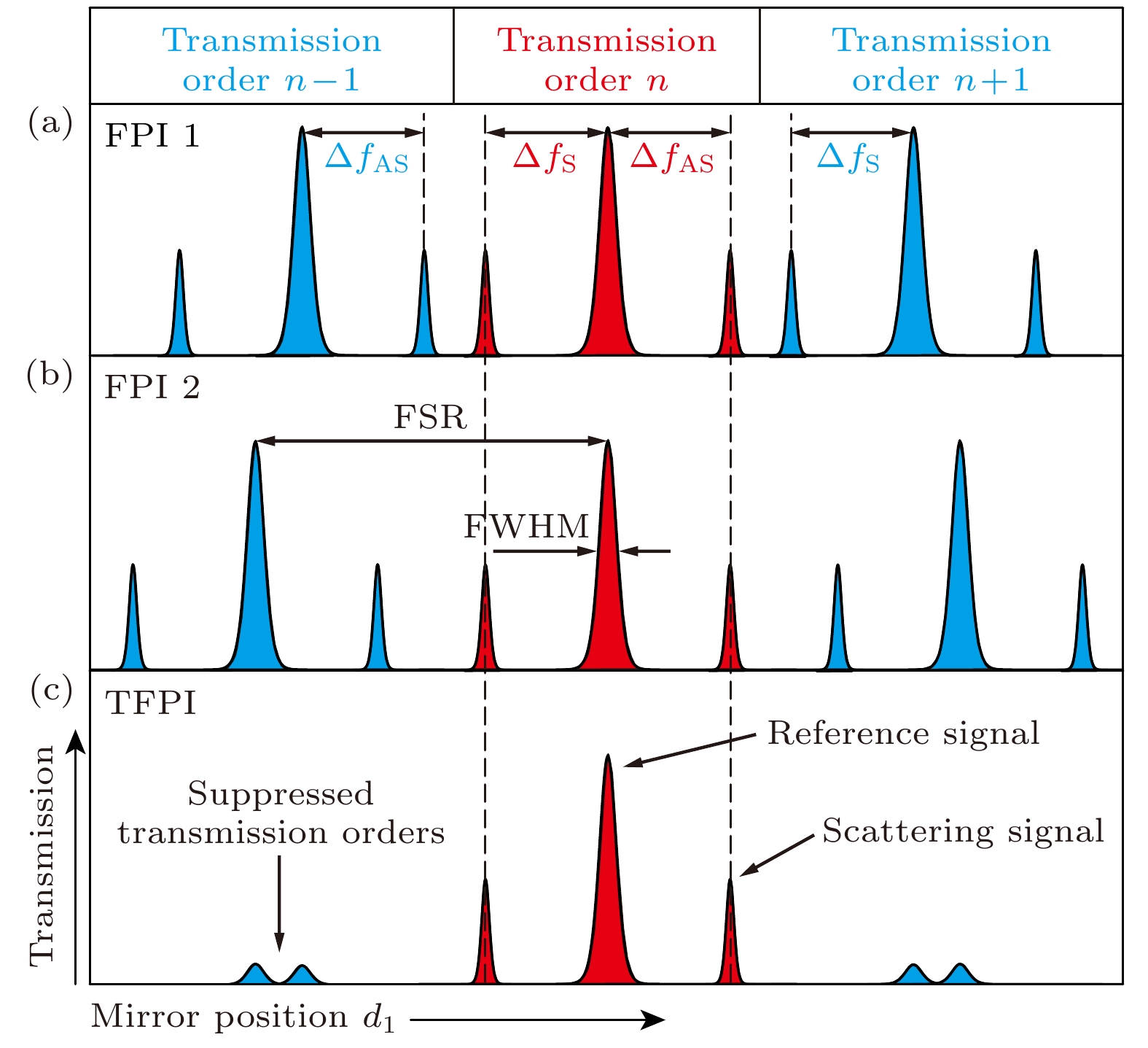 图 4 (a) 和 (b) 分别为FPI 1和FPI 2的透射级次示意图. 由于镜间距不同, 两个FPI的自由光谱范围(FSR)存在差异; (c) 通过镜间距的偏移, 高阶透射级次被抑制, 只有中心透射级次的光能够同时通过两个FPI并到达光子探测器[27]