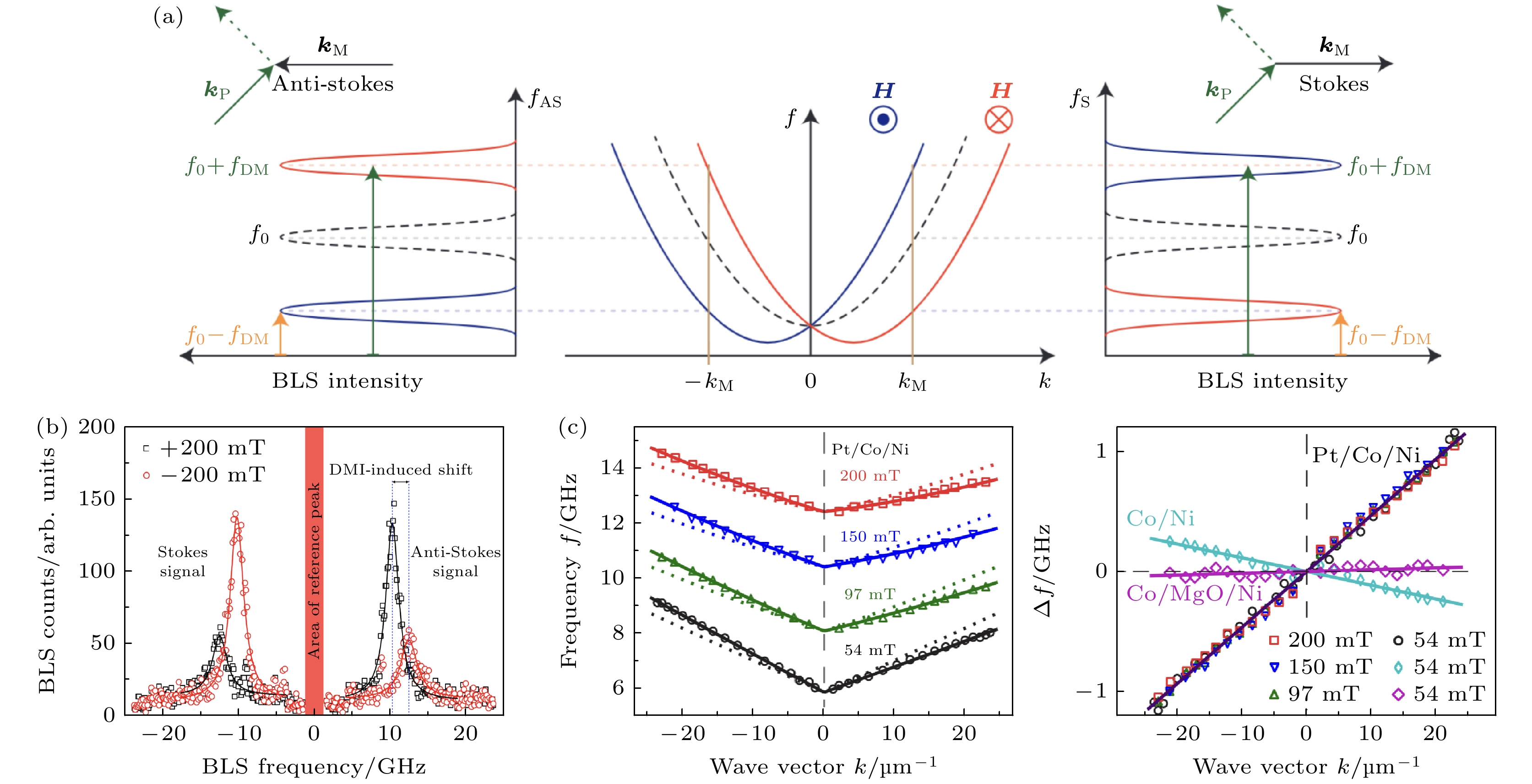 图 6 BLS对自旋波非互易性的研究 (a) DMI导致的BLS中Stokes和anti-Stokes峰频移原理图[18]; (b) DMI引起的BLS谱频移[30]; (c) DMI引起的非对称色散关系及反向传播自旋波频率差随波矢变化[31]