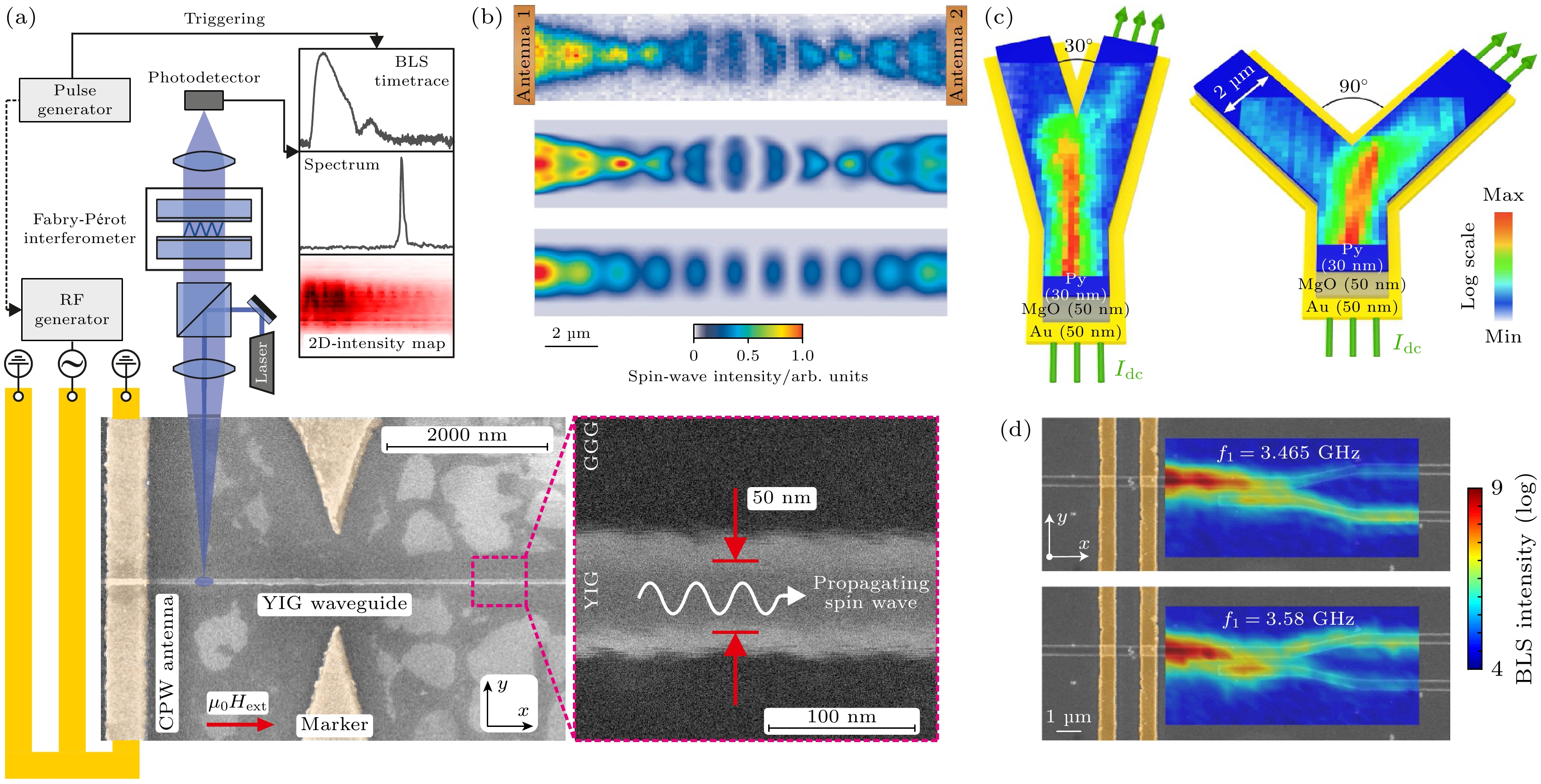 Figure 7. Micro-focused Brillouin light scattering studies. (a) Schematic of the experimental setup and SEM image of the magnonic waveguide[41]. A 50 nm wide YIG waveguide is magnetized along its long axis (backward volume spin wave mode, BVSW) under an external magnetic field of $ \mu_0 H_\text{ext} $ = 55 mT. Spin waves are excited by applying a radio frequency (RF) current to a coplanar waveguide antenna (CPW). Frequency-, time-, and space-resolved scans are performed using micro-focused BLS. (b) two-dimensional intensity map of propagating spin wave interference in Ni81Fe19 stripes, obtained by μBLS measurement[42]. (c) intensity map of spin waves in a Y-shaped waveguide[43]. (d) two-dimensional intensity maps of spin waves at different frequencies in a magnonic directional coupler[44].