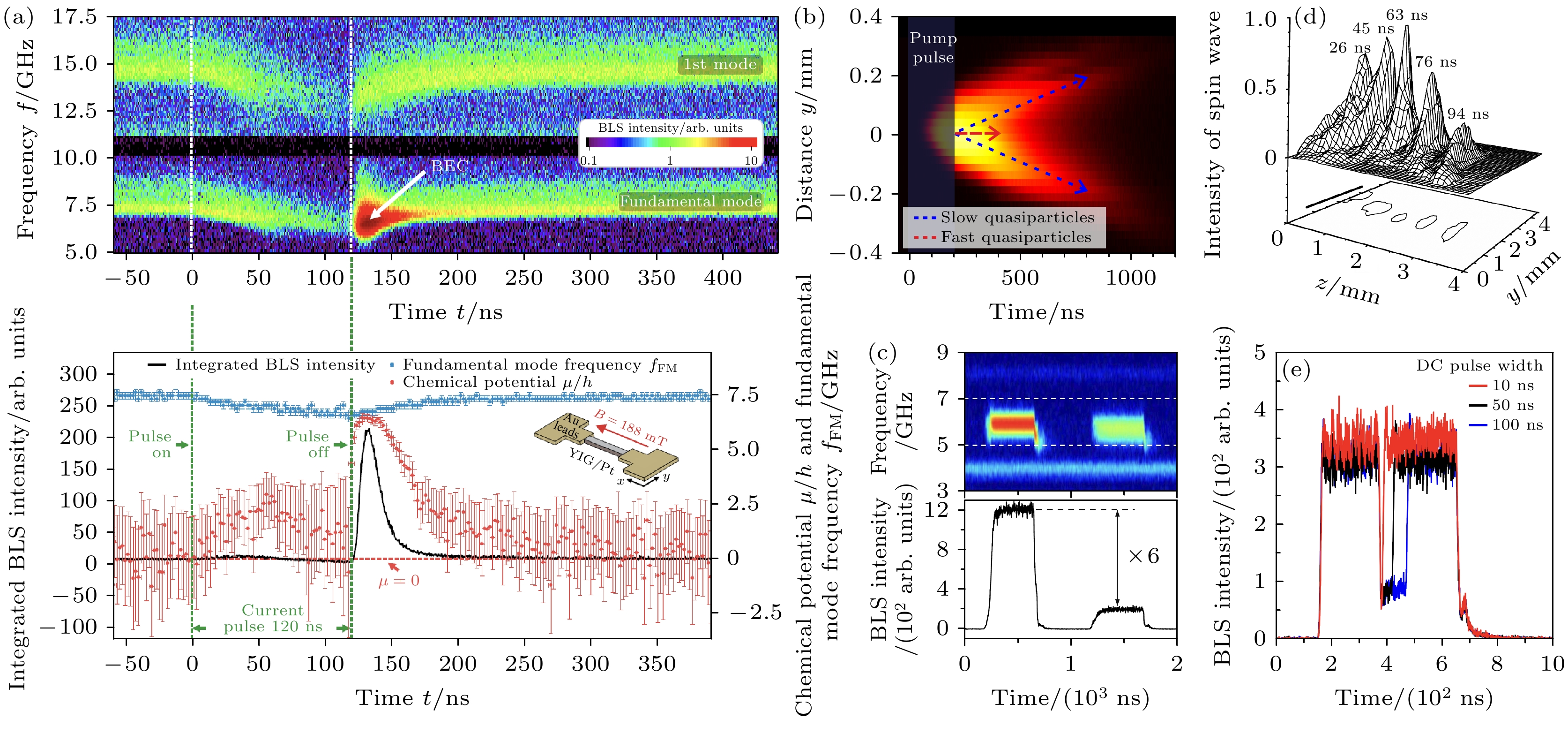 Figure 8. Examples of time-resolved Brillouin light scattering studies: (a) Magnon Bose-Einstein condensation (BEC) achieved via rapid cooling, showing a significant signal at the bottom of the magnon band after pulse termination, indicating BEC formation[45]; (b) spatiotemporal propagation characteristics of fast and slow quasiparticle wave packets in phonon-magnon hybrid states, demonstrating velocity differences for wave packets propagating in different directions[46]; (c) a bistability-based all-magnon repeater achieving approximately 6-fold spin wave signal amplification, illustrating the operational states of the source and pump at different periods[47]; (d) non-stationary self-focusing process of two-dimensional spin wave packets, showcasing the propagation and transverse contraction of spin wave packets under strong nonlinear conditions[48]; (e) nanosecond-fast switchable unidirectional magnon excitation achieved via an asymmetric Oersted field generated by a DC pulse[49].