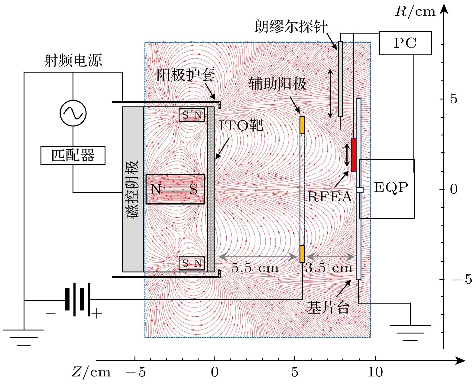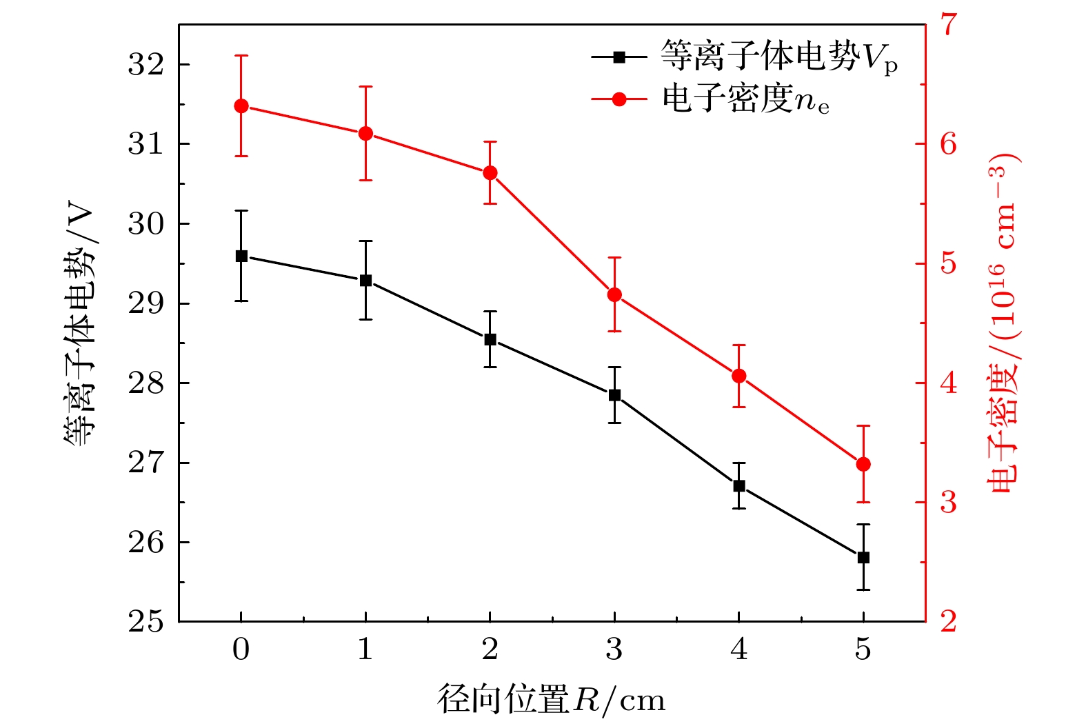 图 13 ITO射频磁控放电中, 辅助阳极电压$ {V}_{\mathrm{A}\mathrm{A}}=0\;\mathrm{V} $条件下近基片台表面等离子体电势Vp及电子密度ne的径向分布情况(气压: 0.6 Pa, 放电功率: 100 W)