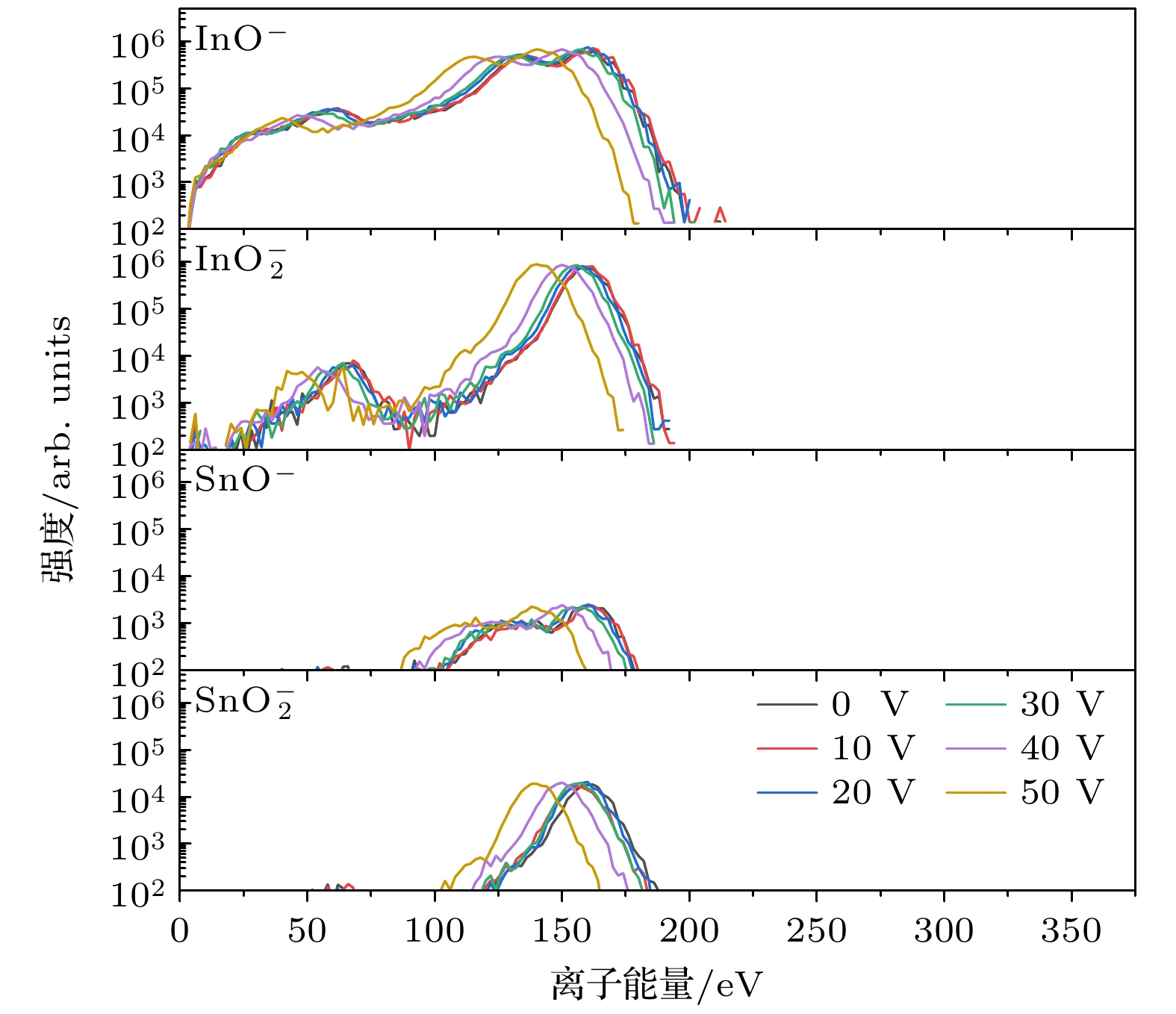 Figure 10. Effect of different auxiliary anode voltages (0 to +50 V) on the energy distributions of negative ions InO– (m/z = 131), ${\mathrm{InO}}_2^- $ (m/z = 147), SnO– (m/z = 134), and ${\mathrm{SnO}}_2^- $ (m/z = 150) in an ITO RFMS discharge (Gas pressure: 0.6 Pa, discharge power: 100 W).