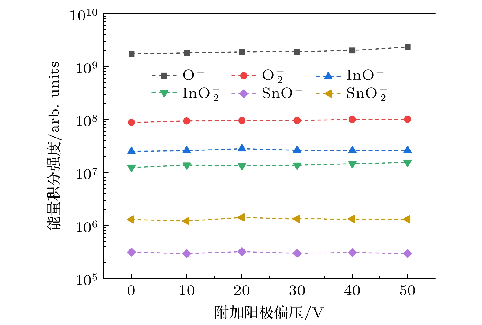 图 11 ITO射频磁控放电中, 不同辅助阳极电压(0—+50 V)下负离子(O–, $\rm O_2^- $, InO–, ${\mathrm{InO}}_2^- $, SnO–和${\mathrm{SnO}}_2^- $)的能量积分强度(气压: 0.6 Pa, 放电功率: 100 W)