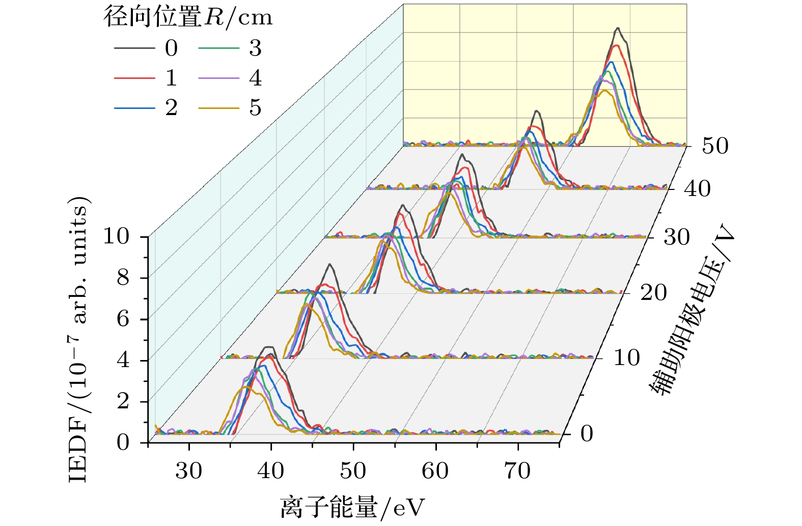 图 4 ITO射频磁控放电中, 不同辅助阳极偏压(0— +50 V)对36Ar+(m/z = 36), 40Ar2+(m/z = 20), O+(m/z = 16)和${\mathrm{O}}_2^+ $(m/z = 32)离子能量分布的影响(气压: 0.6 Pa, 放电功率: 100 W)