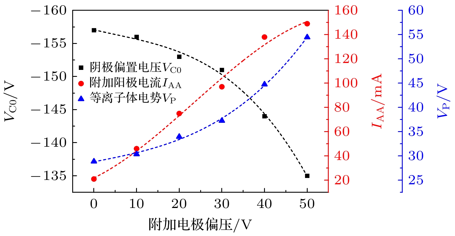 图 2 ITO射频磁控放电中, 阴极偏置电压$ {V}_{\mathrm{C}0} $、附加阳极电流$ {I}_{\mathrm{A}\mathrm{A}} $及等离子体电势$ {V}_{\mathrm{P}} $随辅助阳极偏压$ {V}_{\mathrm{A}\mathrm{A}} $的变化关系