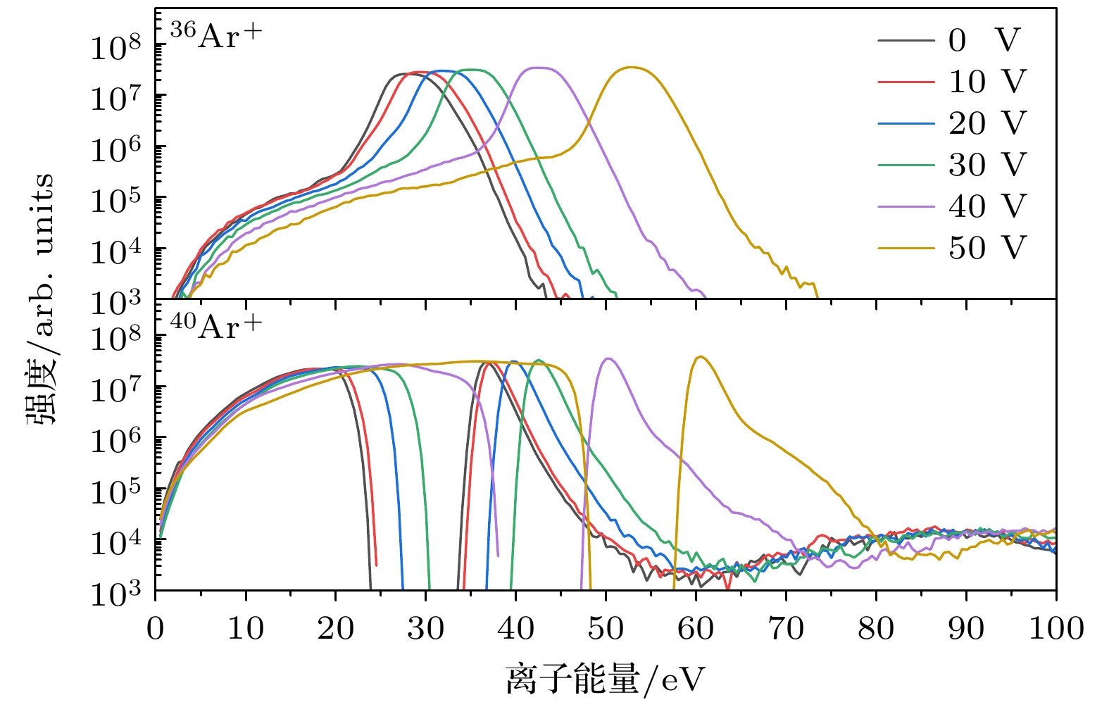 图 3 ITO射频磁控放电中, 不同辅助阳极电压(0—+50 V)对氩同位素离子36Ar+ (m/z = 36)和40Ar+ (m/z = 40)能量分布的影响(气压: 0.6 Pa, 放电功率: 100 W)