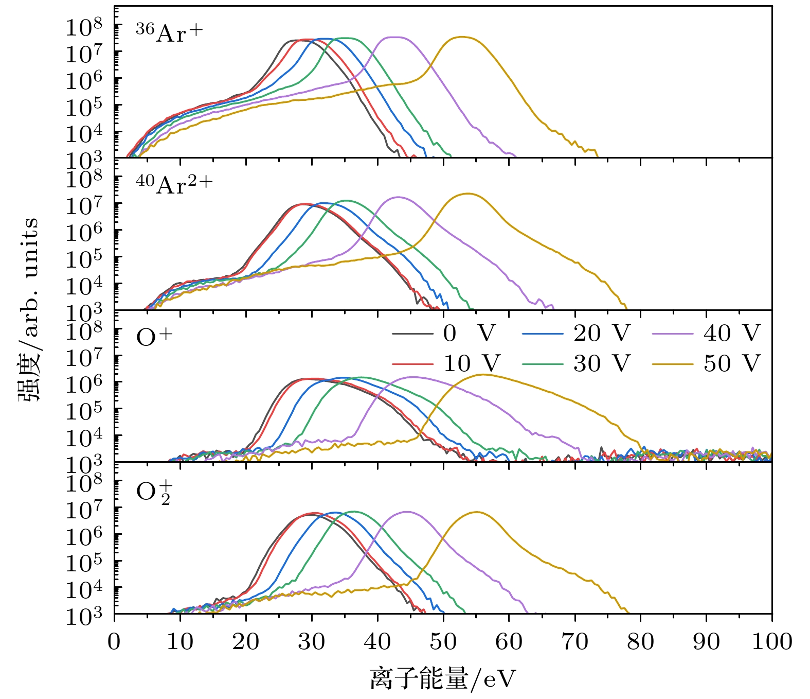 Figure 4. Energy distributions of positive charged 36Ar+ (m/z = 36), 40Ar+ (m/z = 20), O+ (m/z = 16), and ${\mathrm{O}}_2^+ $ (m/z = 32) ions in an ITO RFMS discharge (Gas pressure: 0.6 Pa, discharge power: 100 W). Measurements have been carried out for different auxiliary anode voltages ranging from 0 to +50 V.