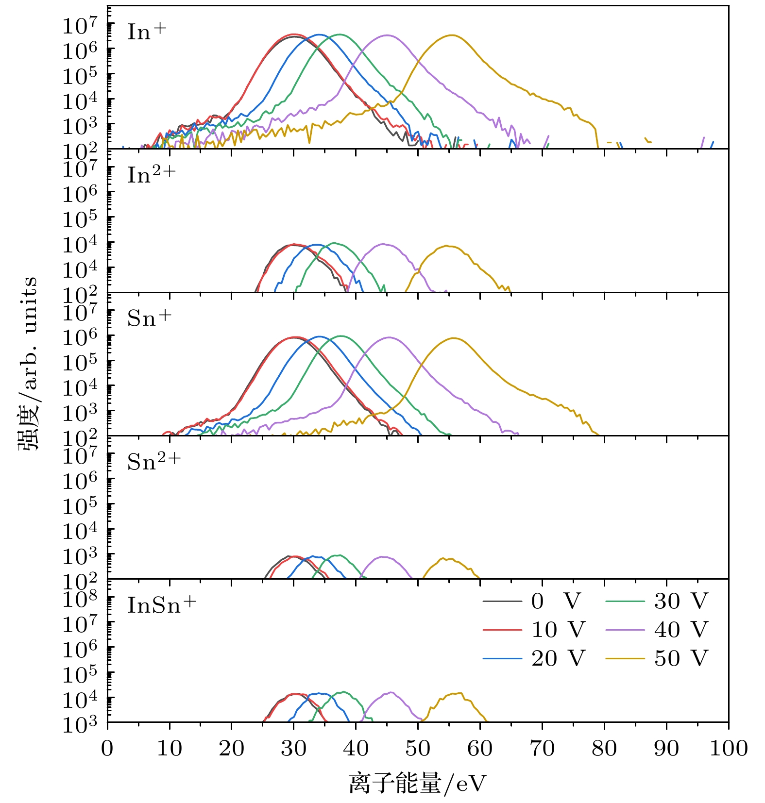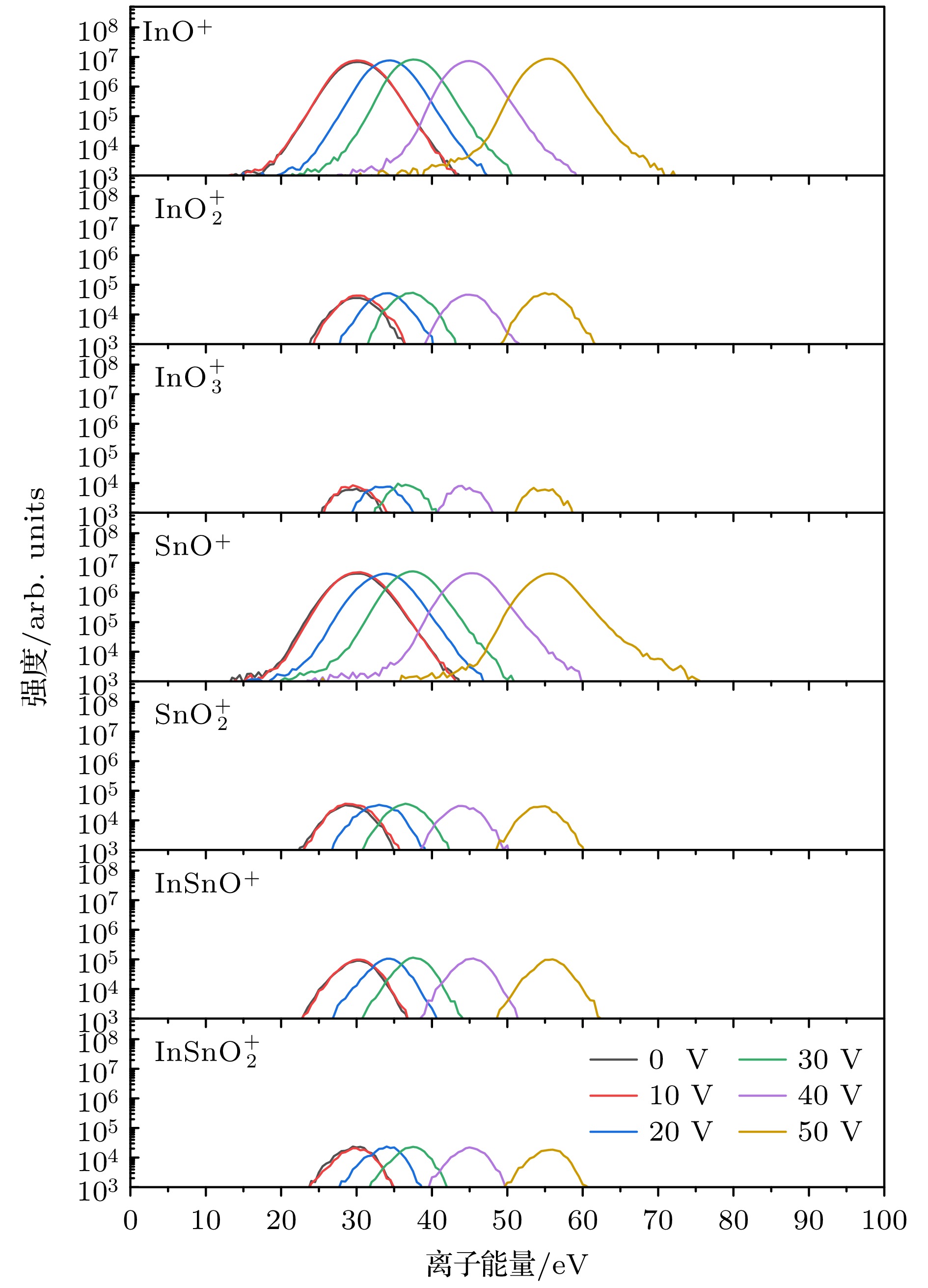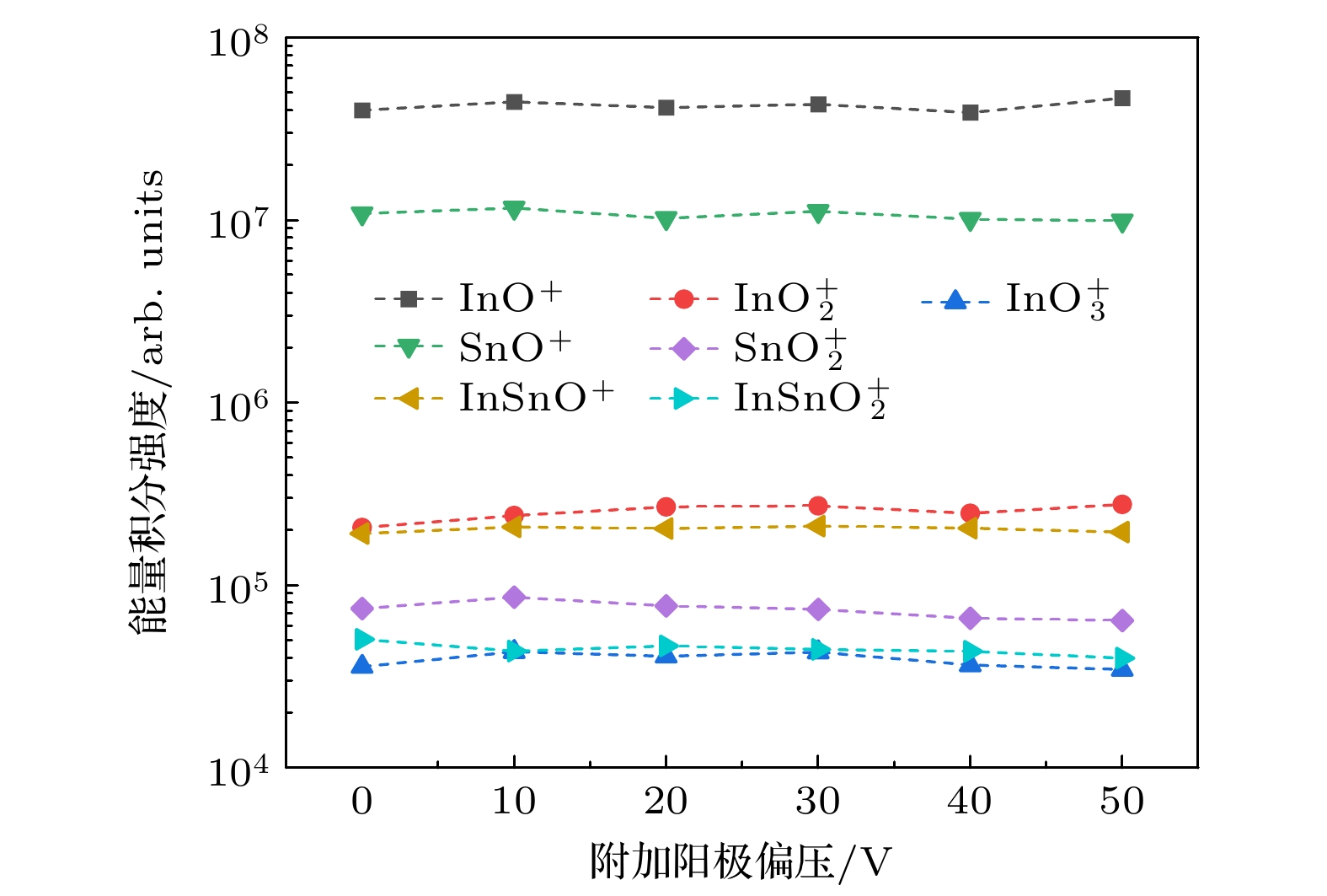 图 8 ITO射频磁控放电中, 不同辅助阳极电压(0—+50 V)下金属氧化物离子(InO+, ${\mathrm{InO}}_2^+ $, ${\mathrm{InO}}_3^+ $, SnO+, ${\mathrm{SnO}}_2^+ $, InSnO+和${\mathrm{InSnO}}_2^+ $)的能量积分强度(气压: 0.6 Pa, 放电功率: 100 W)