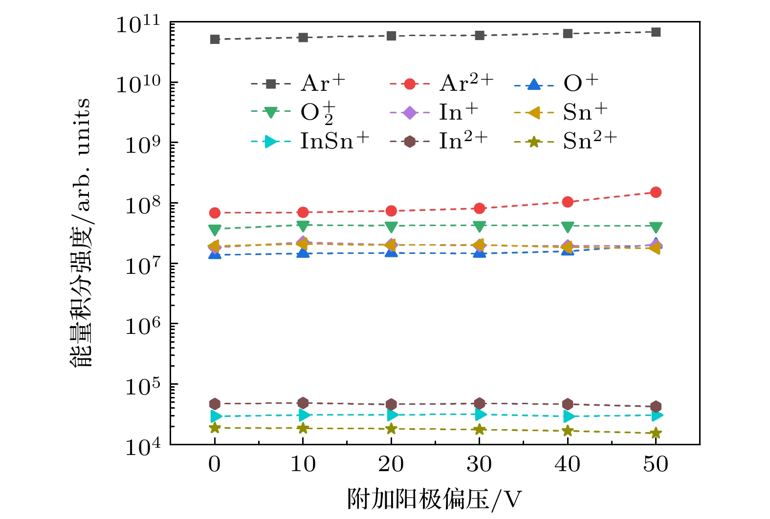图 7 ITO射频磁控放电中, 不同辅助阳极电压(0—+50 V)下单电荷离子(Ar+, O+, O2+, In+, Sn+和InSn+)及双电荷离子(Ar2+, In2+和Sn2+)的能量积分强度(气压: 0.6 Pa, 放电功率: 100 W)