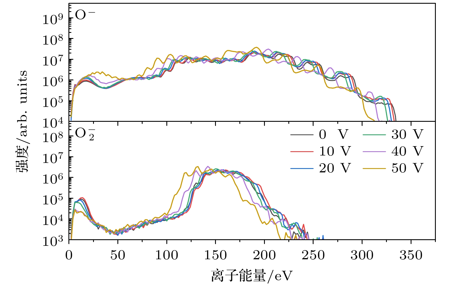 Figure 9. Effect of different auxiliary anode voltages (0 to +50 V) on the energy distributions of O– (m/z = 16) and ${\mathrm{O}}_2^- $ (m/z = 32) negative ions in an ITO RFMS discharge (Gas pressure: 0.6 Pa, discharge power: 100 W).