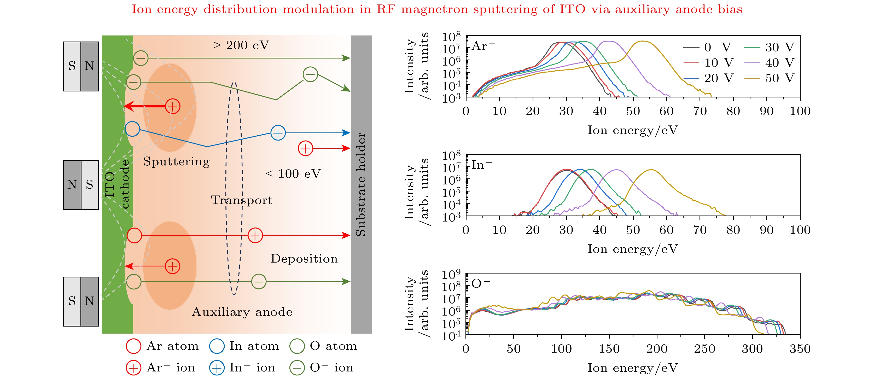 图 9 ITO射频磁控放电中, 不同辅助阳极偏压(0—+50 V)对O–(m/z = 16)和${\mathrm{O}}_2^- $(m/z = 32)负离子能量分布的影响(气压: 0.6 Pa, 放电功率: 100 W)