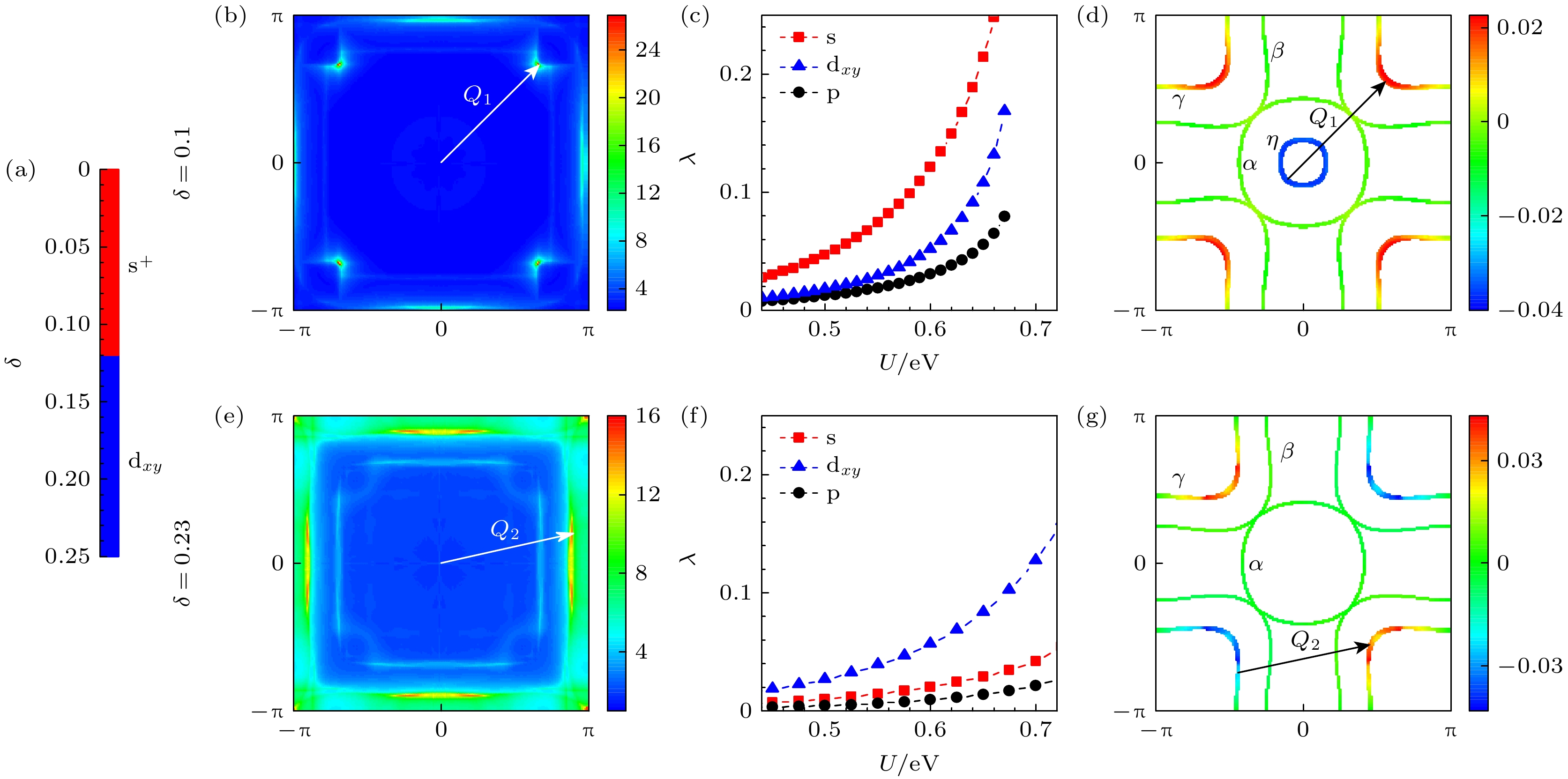 图 16 (La, Pr)3Ni2O7/SrLaALO4薄膜的RPA计算结果[63] (a) 超导配对对称性与空穴掺杂程度δ的关系 (b—d) 空穴掺杂程度$ \delta=0.1 $情形 (b) 自旋极化率的最大本征值在布里渊区的分布, $ \boldsymbol{Q}_1 $为最大值所在位置 (c) 不同配对对称性的配对本征值λ随U的变化. 在所有U下均有s波的λ最大, 体系最终实现的超导配对为s波 (d) 费米面上的能隙函数分布. $ \boldsymbol{Q}_1 $为费米面嵌套矢量 (e—g) 空穴掺杂程度$ \delta=0.23 $情形 (e) 自旋极化率的最大本征值在布里渊区的分布, $ \boldsymbol{Q}_2 $为最大值所在位置 (f) 不同配对对称性的配对本征值λ随U的变化. 在所有U下均有$ d_{xy} $波的λ最大, 体系最终实现的超导配对为$ d_{xy} $波 (g) 费米面上的能隙函数分布. $ \boldsymbol{Q}_2 $为费米面嵌套矢量