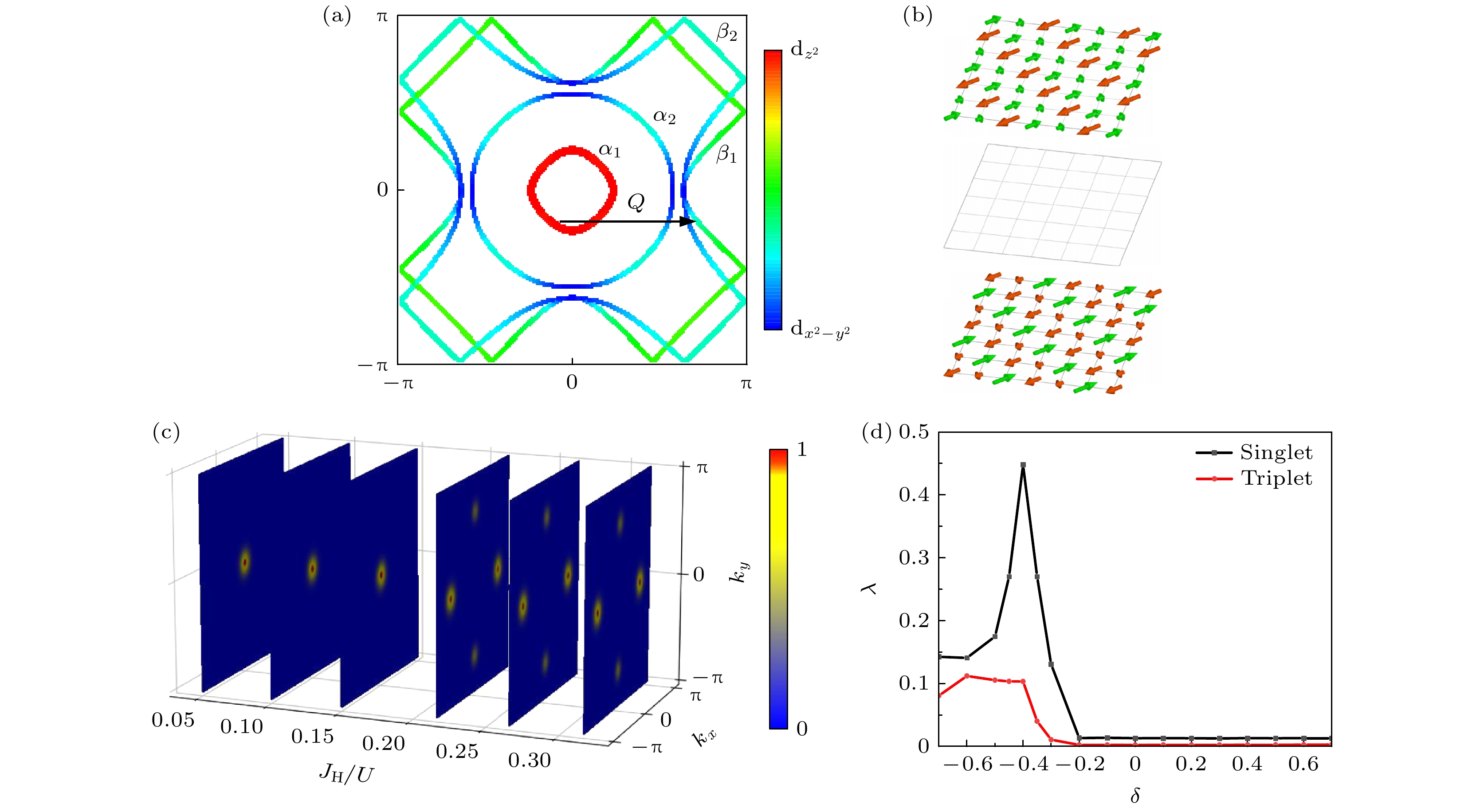 图 19 常压下La4Ni3O10的RPA计算结果[78] (a) 常压下La4Ni3O10在第一布里渊区的费米面, $ {\bf{Q}} $矢量联系了其中的费米面嵌套 (b) 实空间中的SDW模式 (c) 当$ V=0 $时, $ \chi^s $随$ J_H $的变化情况, 其中亮点代表自旋密度波波矢所在位置 (d) λ的最大值对掺杂浓度δ的依赖, 其中$ J_H=U/6 $