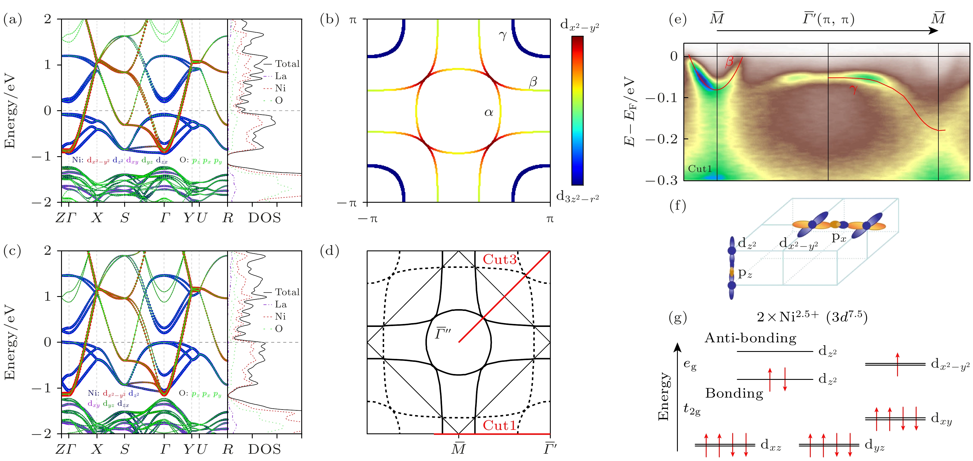图 6 La3Ni2O7的电子结构特征 (a) 高压(29.5 GPa) 下的能带结构及各轨道成分的态密度[1] (b) 对应图(a)的费米口袋[49], 颜色表示轨道成分 (c) 低压(1.6 GPa)下的能带结构及各轨道成分的态密度[1] (d) 与图(c)对应的费米口袋[18]. (a, c)中黑色箭头指向$ d_{z^2} $轨道成键态能带 (e) 常压下$ d_{z^2} $轨道成键态能带(即γ)位于费米能级以下的ARPES实验证据[18] (f) Ni-$ d_{x^2-y^2} $轨道和Ni-$ d_{z^2} $轨道通过与O-$ p_{x, y} $轨道和O-$ p_{z} $轨道杂化成键[1] (g) 原胞内二个Ni原子的3d电子能级结构与占据情况[1]