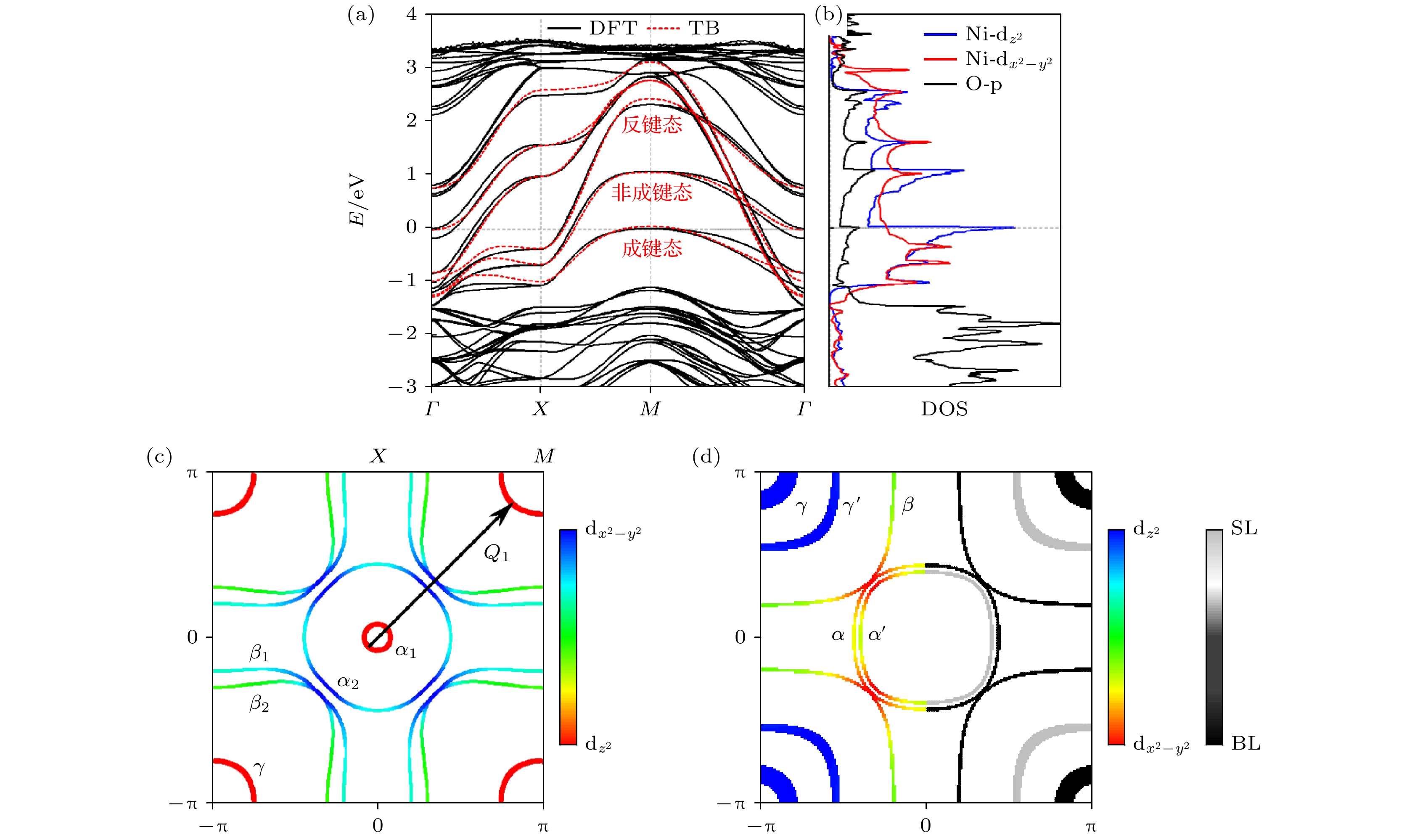 (块材, 高压)RPA [57] 三层多轨道模型 最强自旋涨落波矢$ Q\approx(\pi, \pi) $. $ s^{\pm} $波配对, 对能带细节不敏感. 超导由外层$ d_{{z^2}^2} $轨道间层间配对主导. FRG [56] 三层多轨道模型(考虑$ \alpha_1 $口袋缺失) 与RPA定性一致, 支持$ s^{\pm} $波配对. 强调洪特耦合对超导的影响. 费米面嵌套和能隙分布细节与RPA略有不同. FLEX [54] 三层多轨道模型 解释其相对较低的$ T_c $. La5Ni3O11