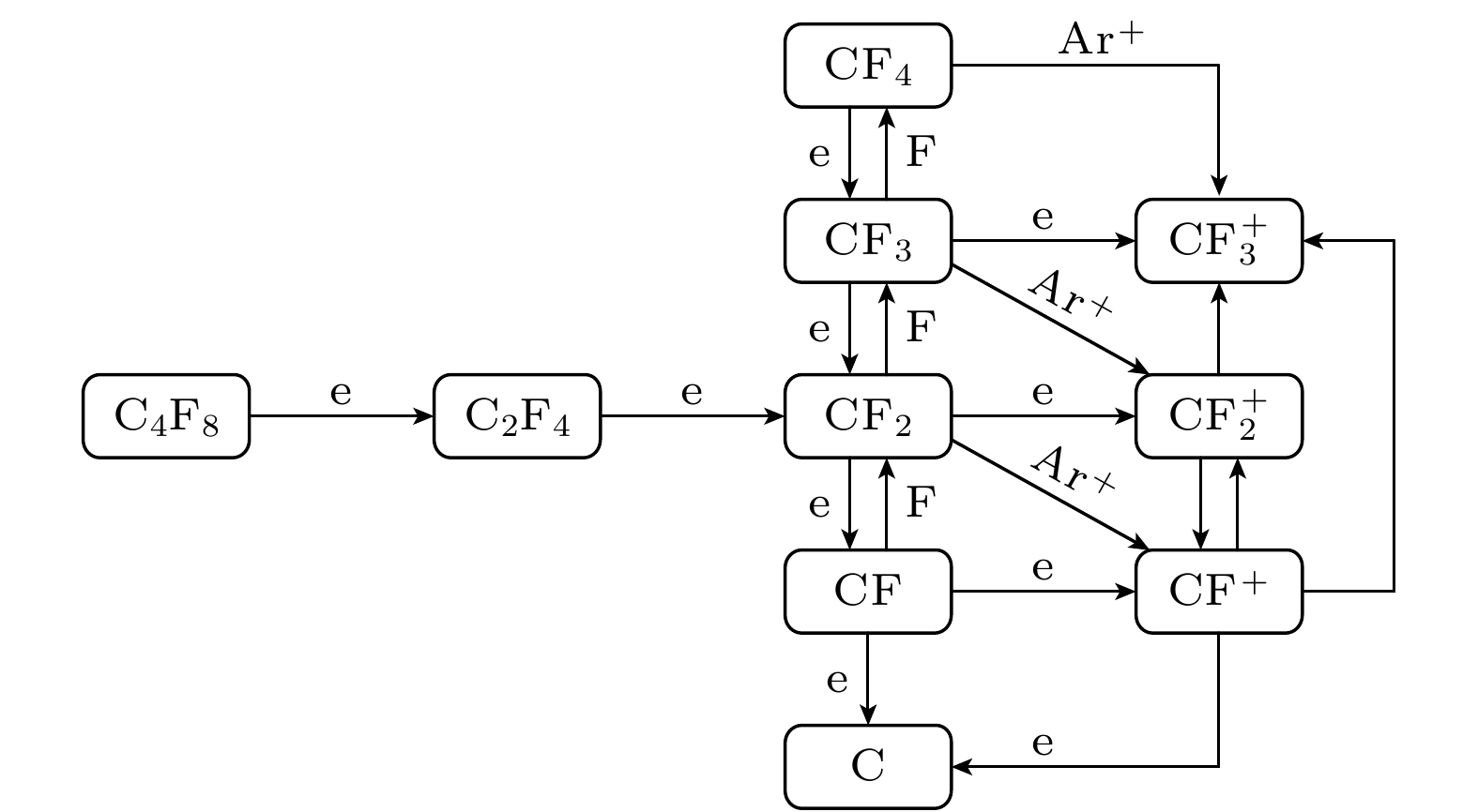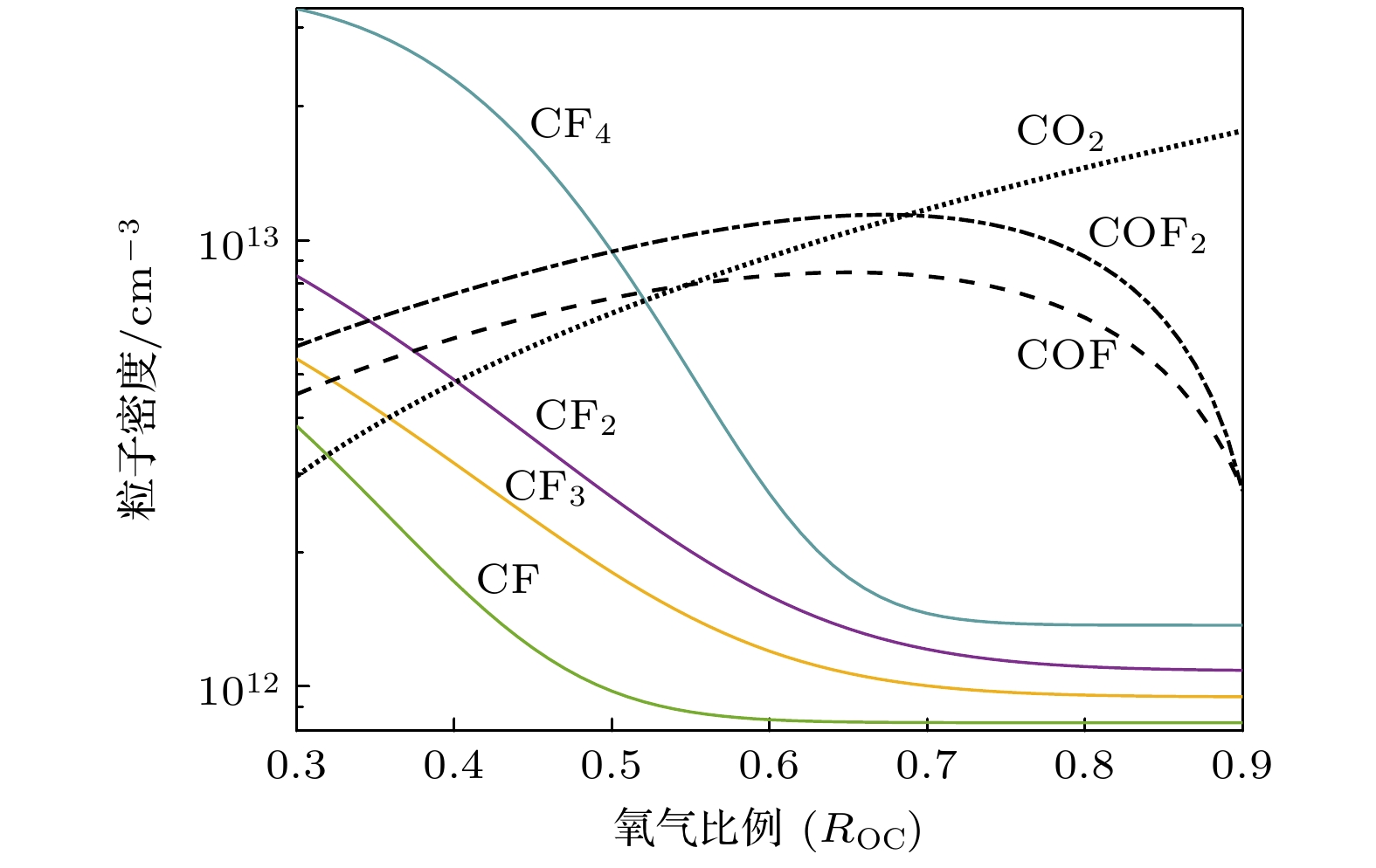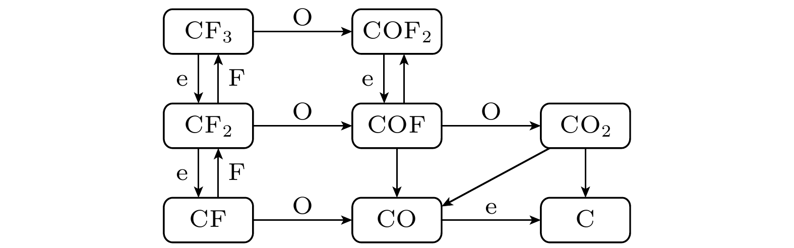 反应编号 反应式 速率系数/(cm3·s–1) 参考文献 a b c 电子碰撞反应 R1 e + C4F8 → 2C2F4 + e 9.58 × 10–8 0.042 8.572 [12] R2 e + C2F4 → 2CF2 + e 1.32 × 10–8 0.412 6.329 [12] R3 e + CF4 → CF3 + F + e 2.10 × 10–9 0.936 12.004 [35] R4 e + CF3 → CF2 + F + e 7.94 × 10–8 –0.452 12.100 [12] R5 e + CF2 → CF + F + e 1.16 × 10–8 –0.380 –14.350 [12] R6 e + CF → C + F + e 4.51 × 10–8 –0.110 8.941 [12] R7 e + F2 → 2F + e 1.08 × 10–8 –0.296 4.464 [12] R8 e + COF2 → COF + F + e 3.20 × 10–9 0.013 10.300 [36] R9 e + CO2 → CO + O + e 2.90 × 10–9 0.302 12.100 [37] R10 e + CO → C + O + e 1.54 × 10–8 0.270 14.600 [38] R11 e + O2 → 2O + e 1.71 × 10–8 –1.270 7.310 [39] R12 e + CF4 → ${\mathrm{CF}}_3^+ $ + F + 2e 2.29 × 10–8 0.680 18.304 [35] R13 e + CF3 → ${\mathrm{CF}}_2^+ $ + F + 2e 7.02 × 10–9 0.430 16.280 [12] R14 e + CF2 → CF+ + F + 2e 5.43 × 10–9 0.561 14.290 [12] R15 e + ${\mathrm{CF}}_3^+ $ → CF2 + F 6.54 × 10–8 –0.500 0.025 [13] R16 e + ${\mathrm{CF}}_2^+ $ → CF + F 6.54 × 10–8 –0.500 0.025 [13] R17 e + CF+ → C + F 6.54 × 10–8 –0.500 0.025 [13] R18 e + CF3 → ${\mathrm{CF}}_3^+ $ + 2e 1.36 × 10–9 0.796 9.057 [12] R19 e + CF2 → ${\mathrm{CF}}_2^+ $ + 2e 1.10 × 10–8 0.393 11.370 [12] R20 e + CF → CF+ + 2e 5.48 × 10–9 0.556 9.723 [12] R21 e + Ar → Ar+ + 2e 7.35 × 10–8 0.208 19.100 [40] 电荷交换反应 R22 $ {\mathrm{CF}}_2^+$ + CF → ${\mathrm{CF}}_3^+ $ + C 2.06 × 10–9 0 0 [13] R23 ${\mathrm{CF}}_2^+ $ + C → CF+ + CF 1.04 × 10–9 0 0 [13] R24 CF+ + CF3 → ${\mathrm{CF}}_3^+ $ + CF 1.71 × 10–9 0 0 [13] R25 CF+ + CF2 → ${\mathrm{CF}}_2^+ $ + CF 1.00 × 10–9 0 0 [13] R26 Ar+ + CF4 → ${\mathrm{CF}}_3^+ $ + F + Ar 4.80 × 10–10 0 0 [13] R27 Ar+ + CF3 → ${\mathrm{CF}}_2^+ $ + F + Ar 5.00 × 10–10 0 0 [13] R28 Ar+ + CF2 → CF+ + F + Ar 5.00 × 10–10 0 0 [13] 氧化反应 R29 CF3 + O → COF2 + F 3.30 × 10–11 0 0 [13] R30 CF2 + O → COF + F 3.10 × 10–11 0 0 [13] R31 CF + O → CO + F 6.60 × 10–11 0 0 [13] R32 COF + O → CO2 + F 9.30 × 10–11 0 0 [13] R33 COF + COF → COF2 + CO 1.00 × 10–11 0 0 [13] R34 C + CO2 → 2CO 1.00 × 10–15 0 0 [41] R35 COF + CF3 → COF2 + CF2 1.00 × 10–11 0 0 [13] R36 COF + CF2 → COF2 + CF 3.00 × 10–13 0 0 [13] R37 COF + CF3 → CO + CF4 1.00 × 10–11 0 0 [13] R38 COF + CF2 → CO + CF3 3.00 × 10–13 0 0 [13] 重组反应 R39 F + CF3 → CF4 2.00 × 10–11 0 0 [13] R40 F + CF2 → CF3 1.80 × 10–11 0 0 [13] R41 F + CF → CF2 9.96 × 10–11 0 0 [13] R42 F2 + CF3 → CF4 + F 1.90 × 10–14 0 0 [13] R43 F2 + CF2 → CF3 + F 8.30 × 10–14 0 0 [13] 表 A2 表面反应集