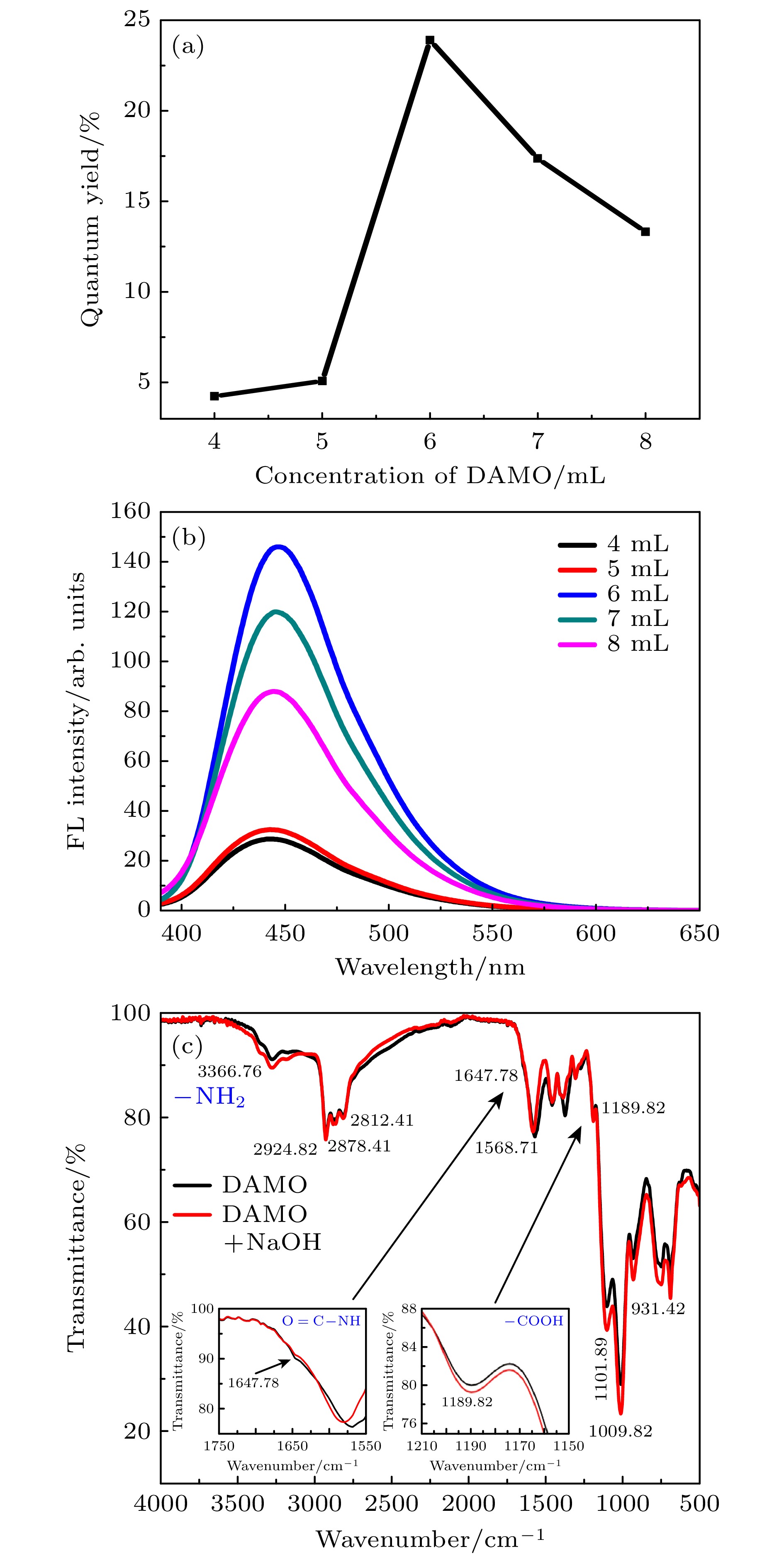 图 2 不同浓度DAMO对碳量子点的(a)荧光量子产率和(b)荧光光谱的影响; (c) 加入NaOH前后碳量子点样品的傅里叶变换红外光谱, 经许可转载[30]