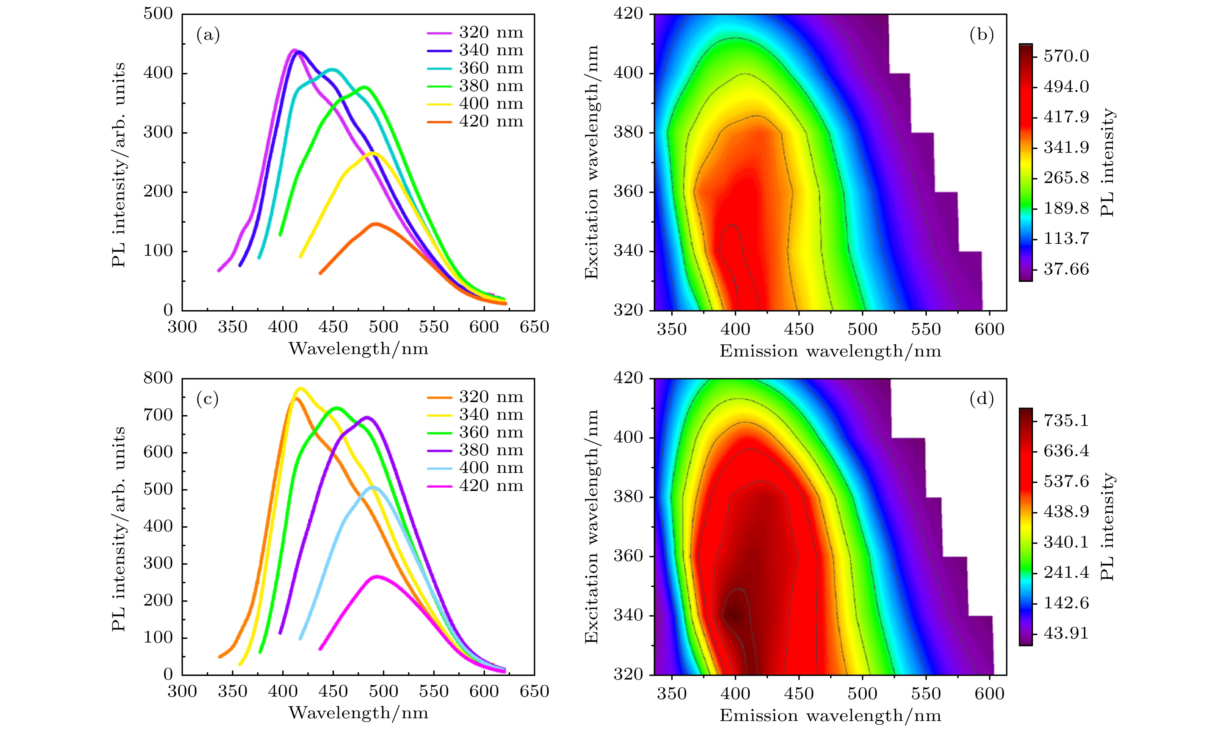 图 3 (a), (b) 等离子体处理30 min制备的氮掺杂碳量子点的光致发光光谱和二维激发-发射等高线图; (c), (d) 等离子体处理60 min制备的氮掺杂碳量子点的光致发光光谱和二维激发-发射等高线图, 经许可转载[32]