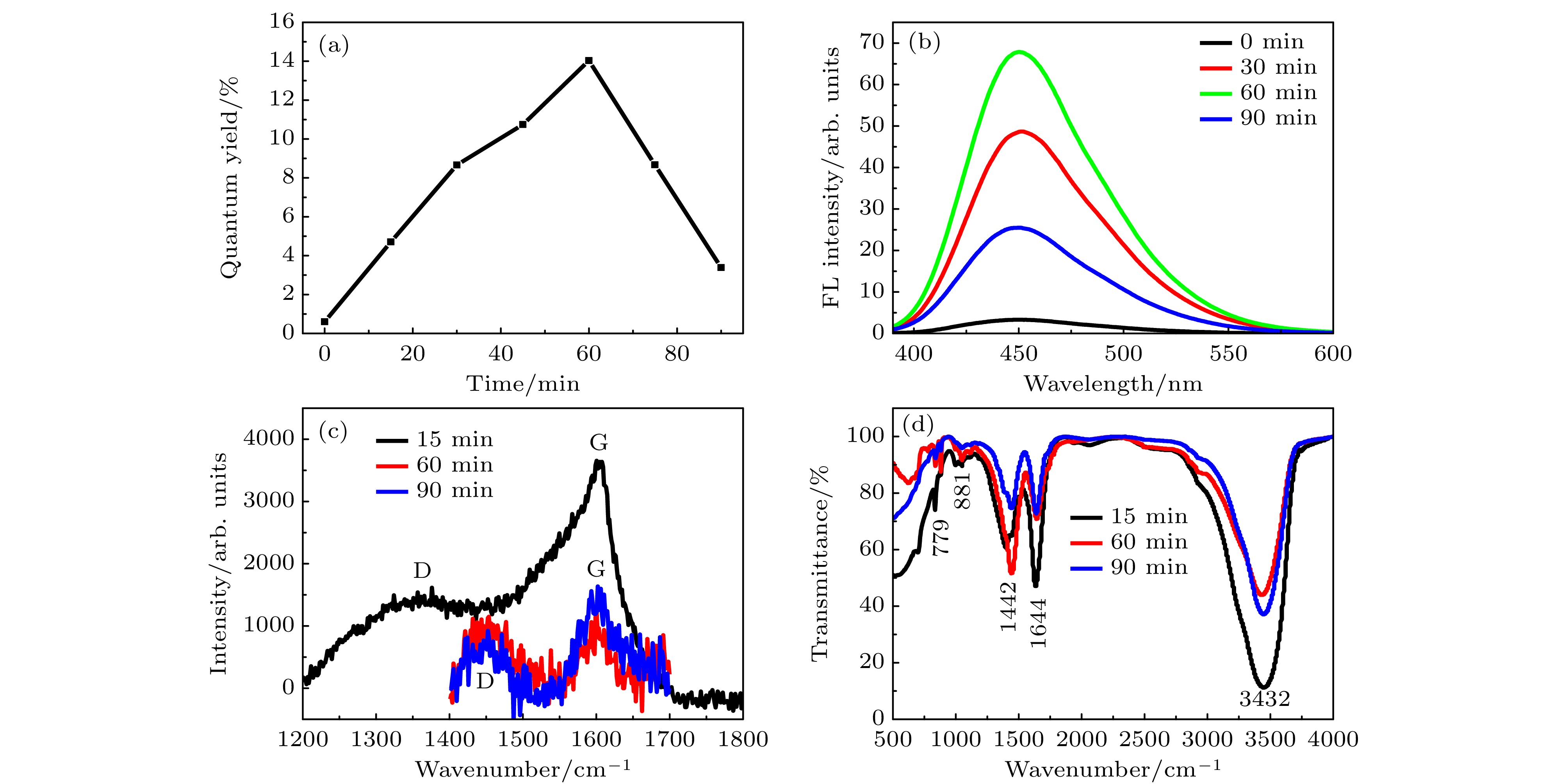 图 4 等离子体处理碳量子点的90 min在线测量的(a)荧光量子产率和(b)荧光光谱; 反应时间为15 min, 60 min和90 min制备的碳量子点的(c)拉曼光谱和(d)傅里叶变换红外光谱, 经许可转载[34]
