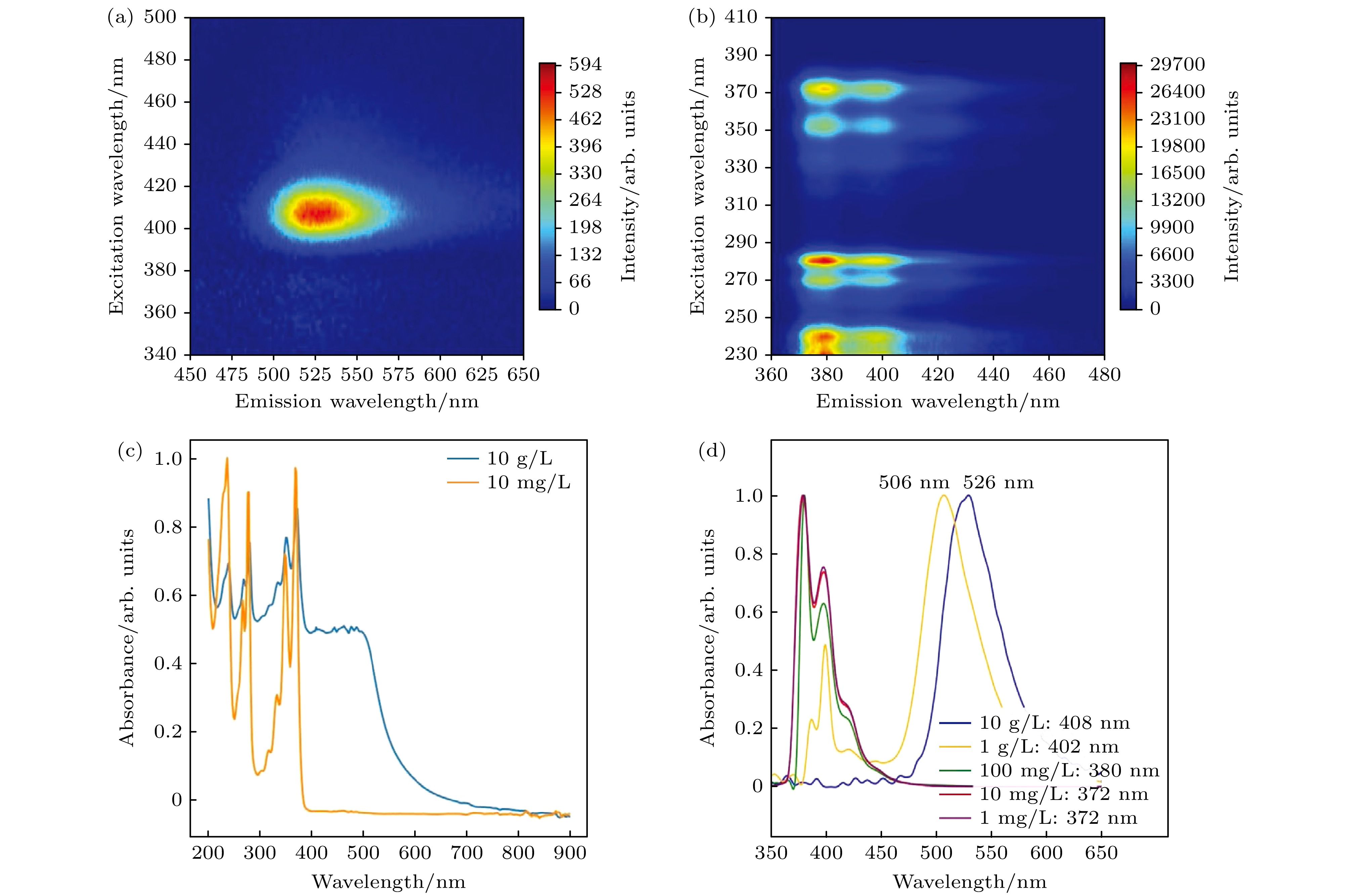 图 7 (a)—(c) 碳量子点浓度分别为10 g/L和10 mg/L的三维荧光光谱和吸收光谱; (d) 不同浓度碳量子点的荧光光谱, 经许可转载[37]