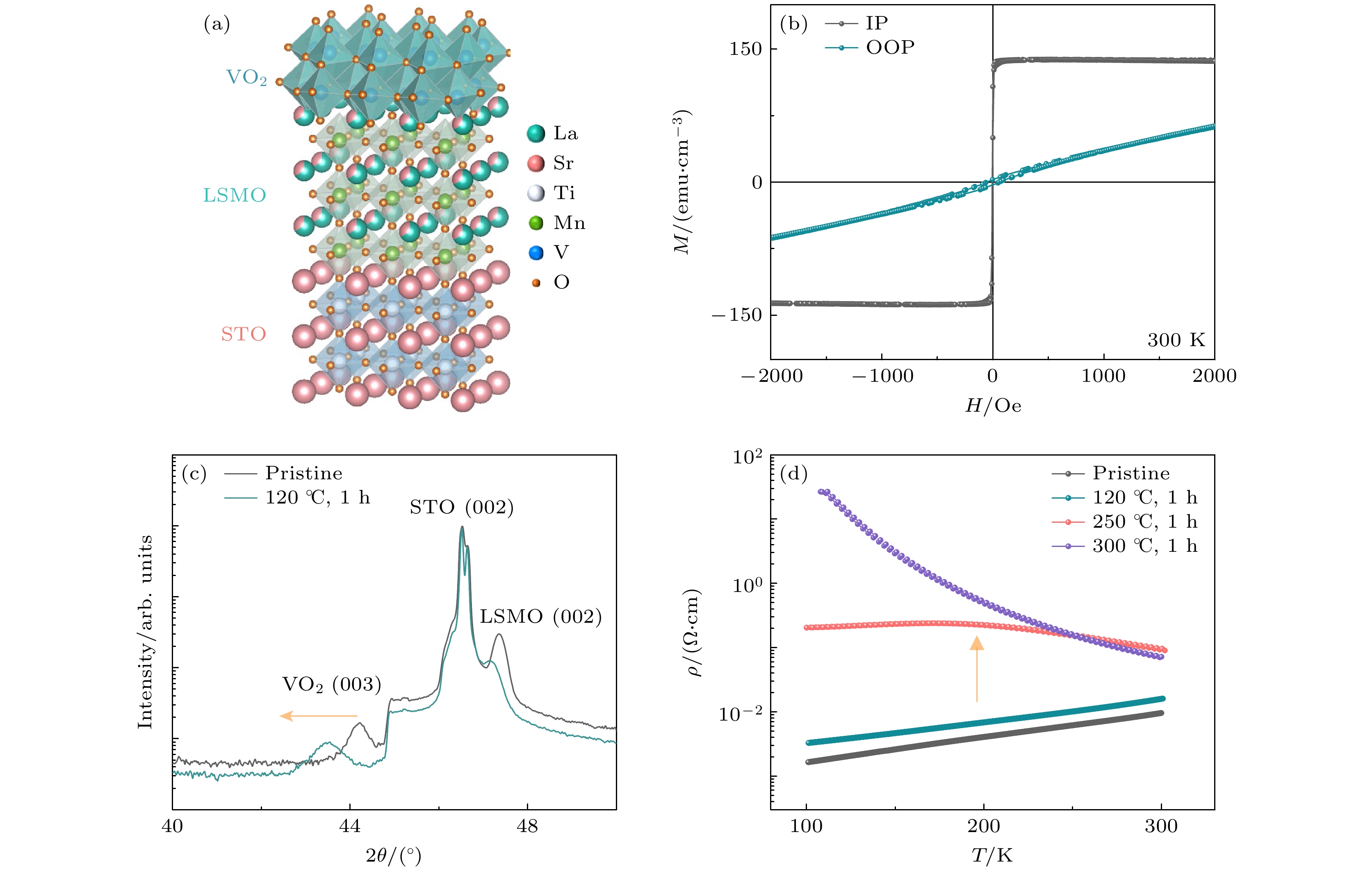 Figure 1. Hydrogen-related structural and electronic state evolution in VO2 (B)/LSMO heterostructure: (a) Schematic of the grown VO2(B)/LSMO/STO (001) heterostructure; (b) magnetic hysteresis loops for the grown VO2(B)/LSMO heterostructure at room temperature; (c) XRD patterns compared for as-prepared VO2(B)/LSMO heterostructure before and after hydrogenation; (d) temperature dependence of material resistivity (ρ-T) as compared for the VO2(B)/LSMO heterostructure under different hydrogenation conditions.