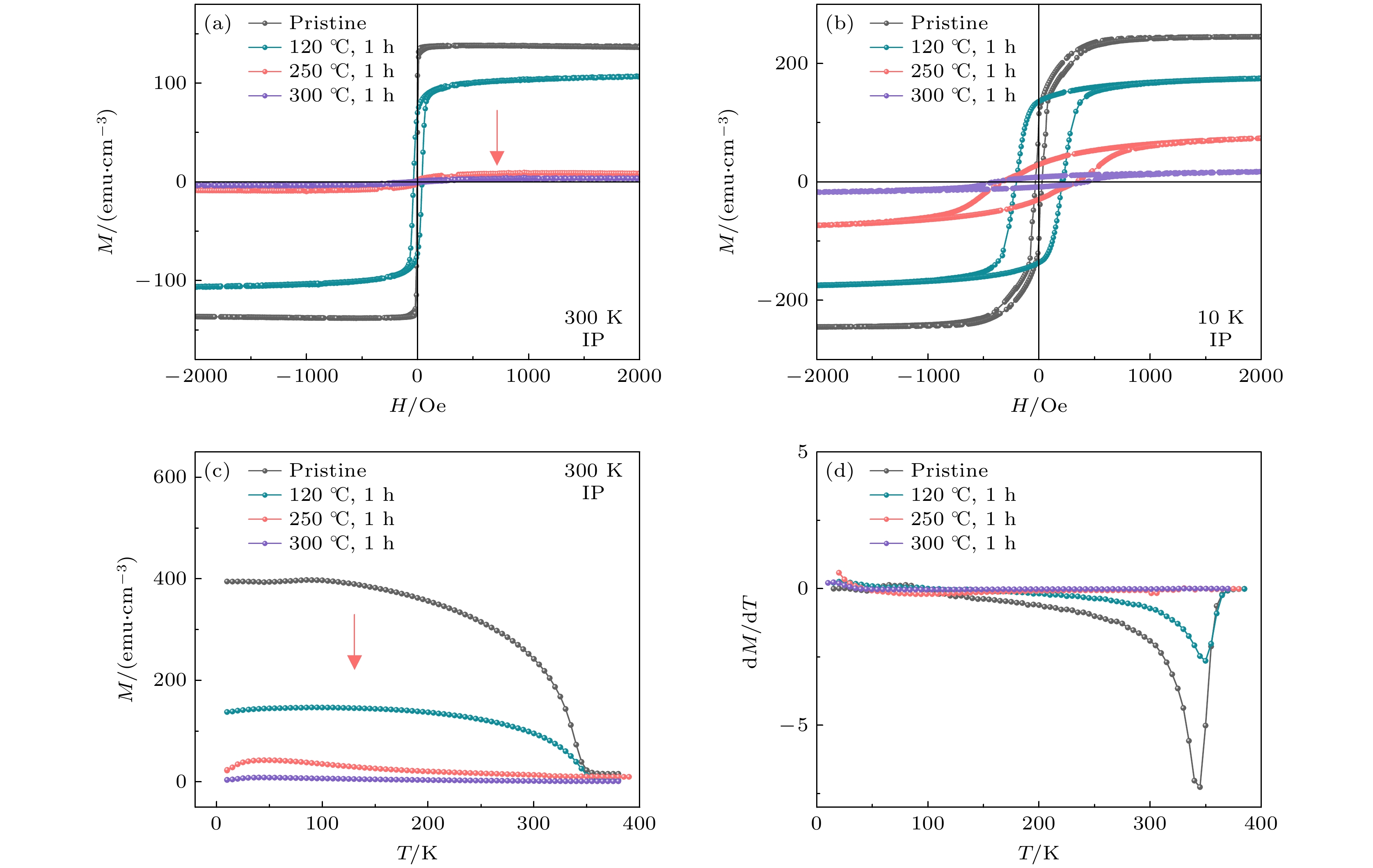Figure 2. Hydrogen-related magnetic phase transition in VO2(B)/LSMO heterostructure: (a) Comparing the in-plane magnetic hysteresis loops for the pristine and hydrogenated VO2(B)/LSMO heterostructure at room temperature; (b) comparing the in-plane magnetic hysteresis loops between the pristine and hydrogenated VO2(B)/LSMO heterostructure at 10 K; (c) temperature dependence of magnetization for VO2(B)/LSMO heterostructure under an external magnetic field of 300 Oe; (d) temperature dependence of dM/dT for the grown VO2(B)/LSMO heterostructure.