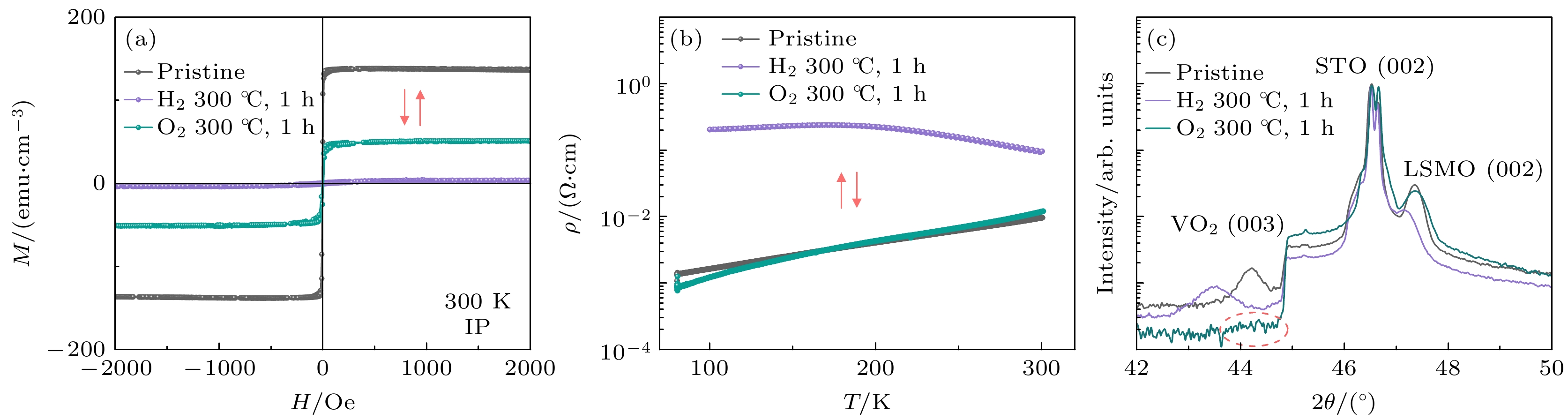 Figure 3. Reversible magnetoelectric transitions in VO2(B)/LSMO heterostructure: (a) Comparing the magnetic hysteresis loops for hydrogenated and dehydrogenated VO2(B)/LSMO heterostructure; (b) comparing the ρ-T tendencies for hydrogenated and dehydrogenated VO2(B)/LSMO heterostructure; (c) comparing the XRD spectra for hydrogenated and dehydrogenated VO2(B)/LSMO heterostructure.