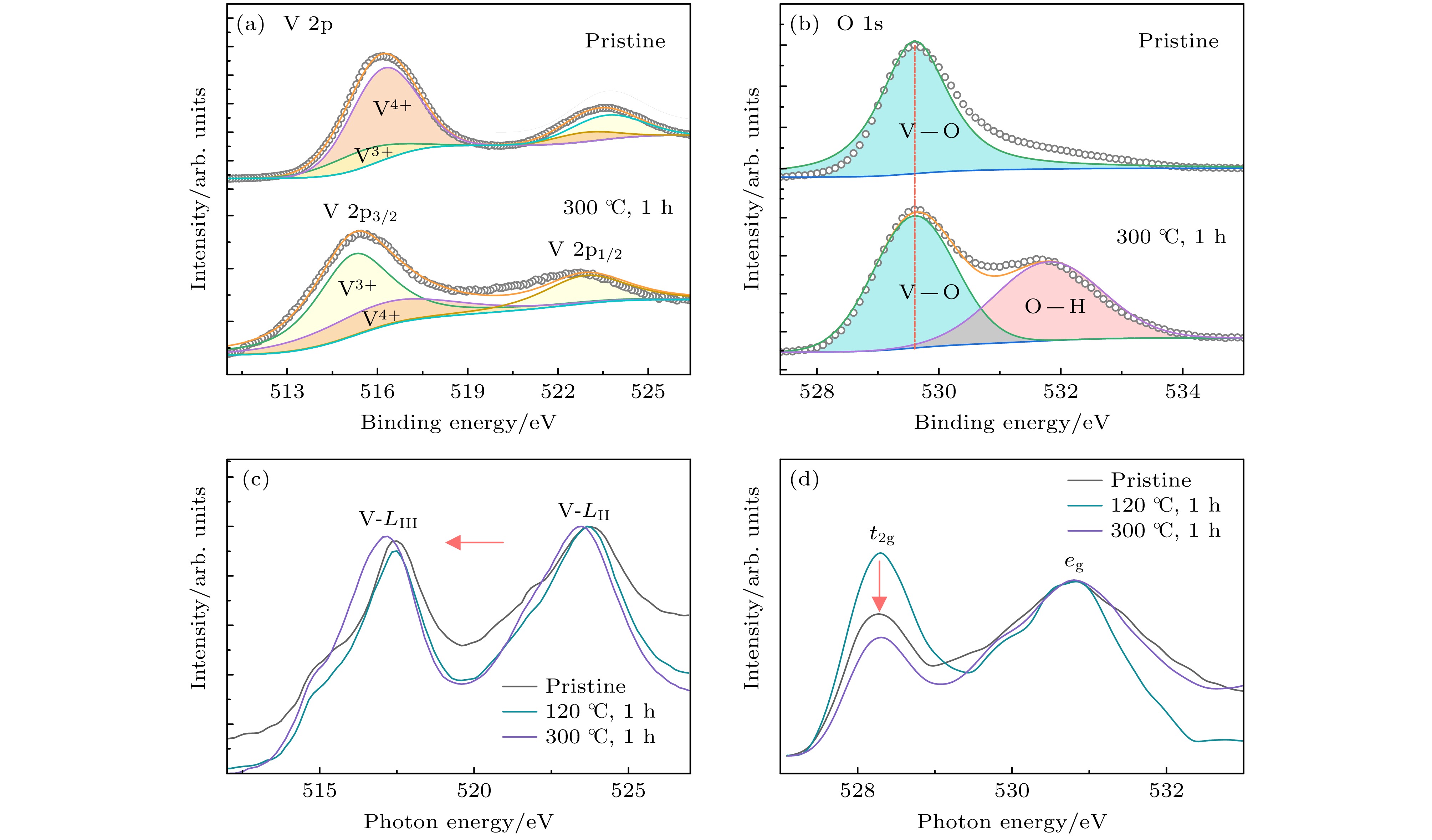 Figure 4. Hydrogen-triggered variations in the chemical environment and electronic structure of VO2(B)/LSMO heterostructures through hydrogenation: (a), (b) X-ray photoelectron spectroscopy (XPS) spectra of VO2(B)/LSMO heterostructures upon hydrogenation; (a) V-2p core-level spectra; (b) O-1s core-level spectra; (c), (d) Synchrotron-based soft X-ray absorption spectra (sXAS) for the grown VO2(B)/LSMO heterostructures through hydrogenation; (c) V-L edge spectra; (d) O-K edge spectra.