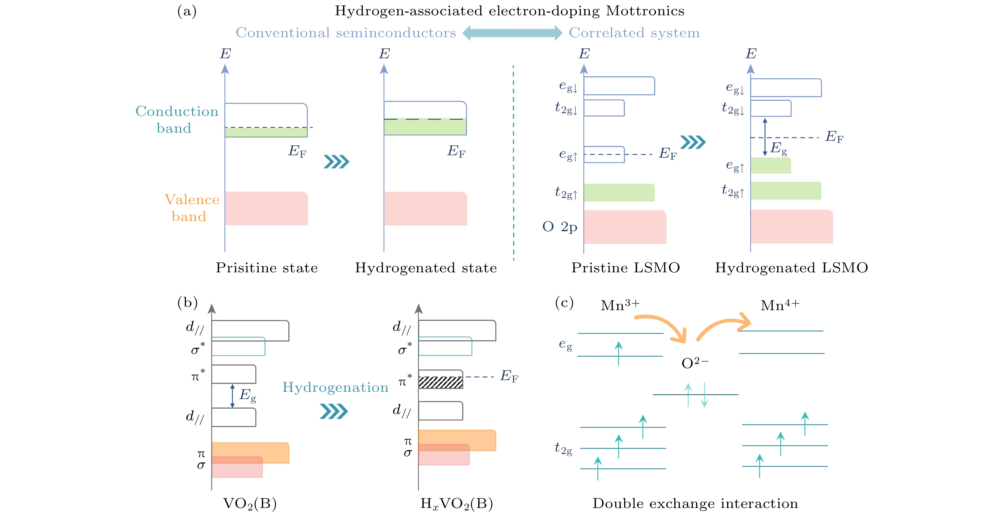 Figure 5. Hydrogenation-induced magnetoelectric transitions in VO2 (B)/LSMO system: (a) Schematic diagram of comparing the hydrogen-induced electronic phase transitions in traditional semiconductors and correlated system; (b) illustration of hydrogen-triggered variations in the electronic orbital configuration of VO2(B); (c) schematic diagram of the suppression in Mn3+-Mn4+ double-exchange interaction in LSMO.