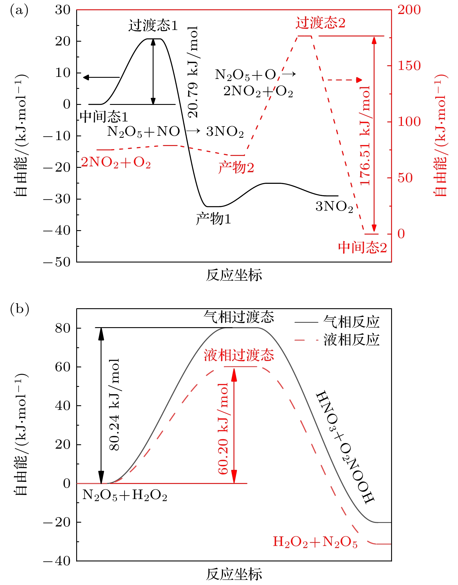 图 3 基于DFT计算的空气等离子体处理水溶液体系中N2O5相关反应 (a) N2O5与NO自由基或O原子反应自由能变化图[42]; (b) N2O5与H2O2的气液相反应自由能变化图