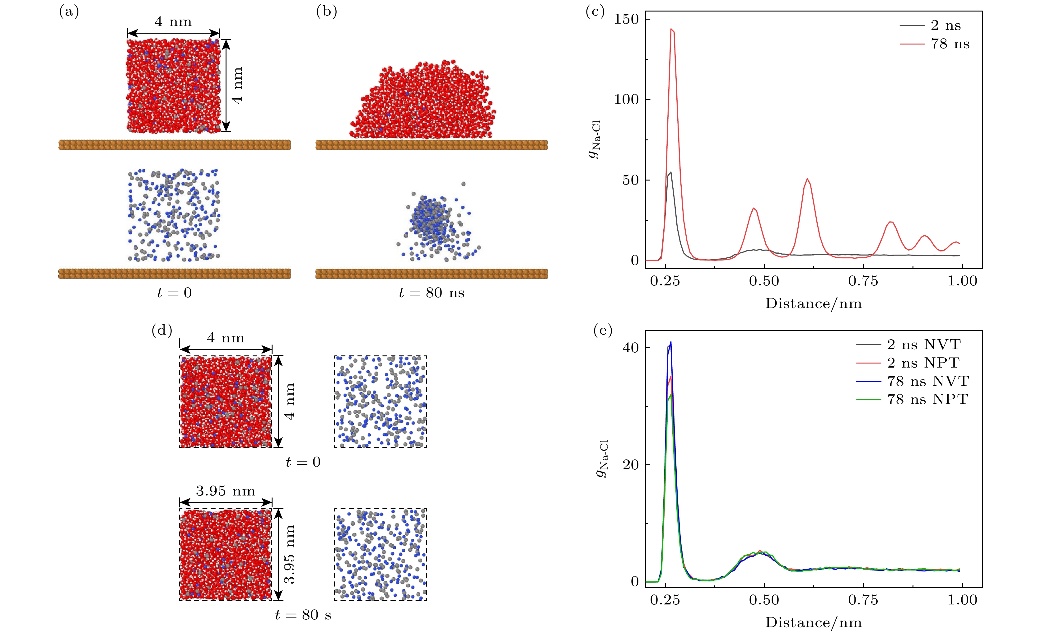 图 1 (a) 模拟初始构型(t = 0, 液滴的尺寸为4 nm×4 nm×4 nm, 离子浓度为4.50 mol/kg, 衬底在xy方向的尺寸分别为10.182 nm和10.224 nm)的侧视图, 其中红色、白色、蓝色和灰色分别表示氧、氢、钠、氯; (b) 模拟结果(t = 80 ns)侧视图, 80 ns后液滴中的离子形成了氯化钠晶体; (c) 不同模拟时间对应的离子径向分布函数(RDF); (d) 体相溶液的初始构型(液滴的尺寸为4 nm×4 nm×4 nm, 浓度为4.50 mol/kg, 采用三维周期性边界条件)和80 ns后液滴的状态和离子分布侧视图(NPT系统, 虚线框表示周期性边界); (e) 体相溶液中离子的RDF, 分别采用NVT系综和NPT系综进行计算, 均没有出现结晶