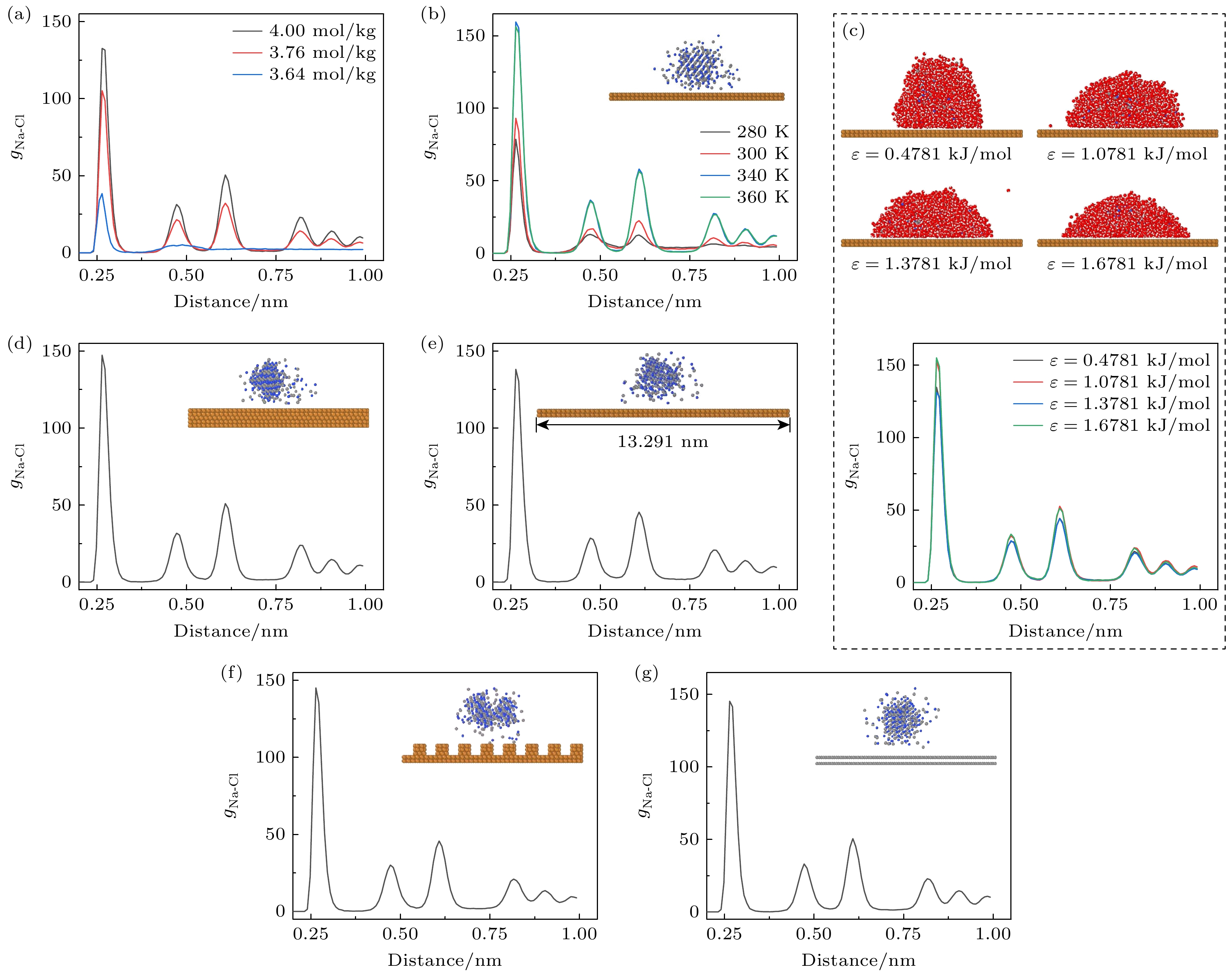 图 2 纳米液滴在不同固体上的结晶行为 (a) 氯化钠浓度分别为4.00, 3.76和3.64 mol/kg液滴中形成的晶体对应的RDF; (b) 在280, 300, 340和360 K下, 氯化钠溶液中得到的晶体的RDF, 插图为300 K下结晶的侧视图; (c) 在不同作用强度参数的原子构成的固体上, 液滴中出现的晶体对应的RDF; (d) 增大固体厚度至0.835 nm后, 氯化钠溶液中得到的晶体的RDF; (e) 增大固体xy方向的尺寸至13.281 nm×13.291 nm后形成的晶体的RDF; (f) 增加固体表面纳米结构(沟道在x方向的宽度为0.89 nm, y方向的宽度为0.77 nm)后形成的晶体的RDF; (g) 采用双层石墨烯(尺寸为10.226 nm×10.332 nm)作为固体衬底; 氯化钠溶液中形成的晶体的RDF