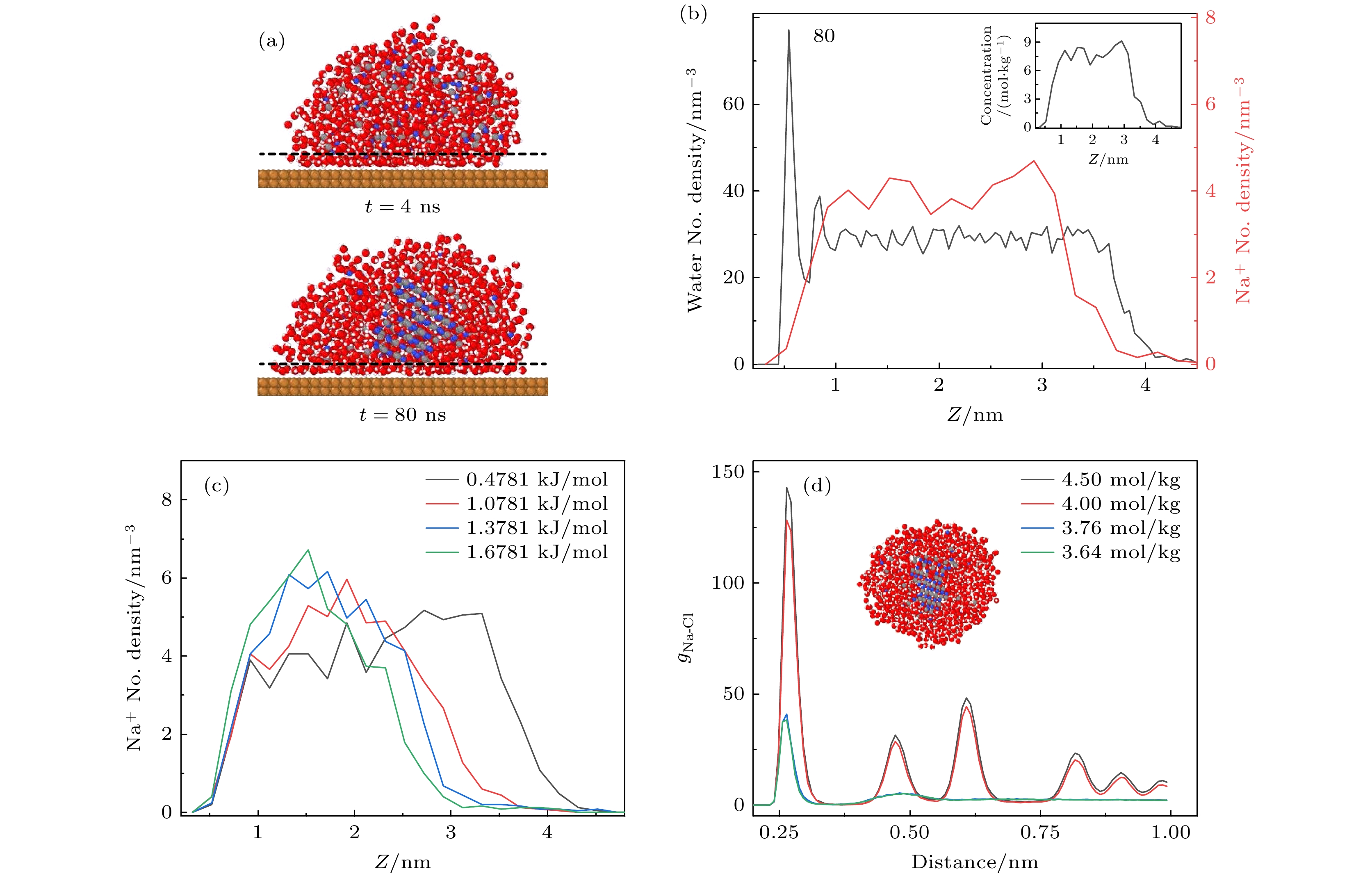 Figure 3. (a) The side view of the cross-section of the nano-droplet at 4 ns and 80 ns, the water molecule layer occupies the space between ions and the solid surface as denoted by the dashed black line; (b) the spatial distribution of water molecules and Na+ ions, the position of Z = 0 is defined as the top surface of the solid, inset represents the distribution of the concentration of NaCl; (c) the spatial distribution of Na+ ion for different $ {\varepsilon }_{\mathrm{S}} $ in Eq. (1); (d) the RDF of ions in the isolated droplets with different concentrations at 78 ns, the ions inside the droplet with concentrations of 4.50 mol/kg and 4.00 mol/kg form the NaCl crystal, inset represents the side view of the cross-section of the crystal formed in the isolated nano-droplet with concentration of 4.50 mol/kg.