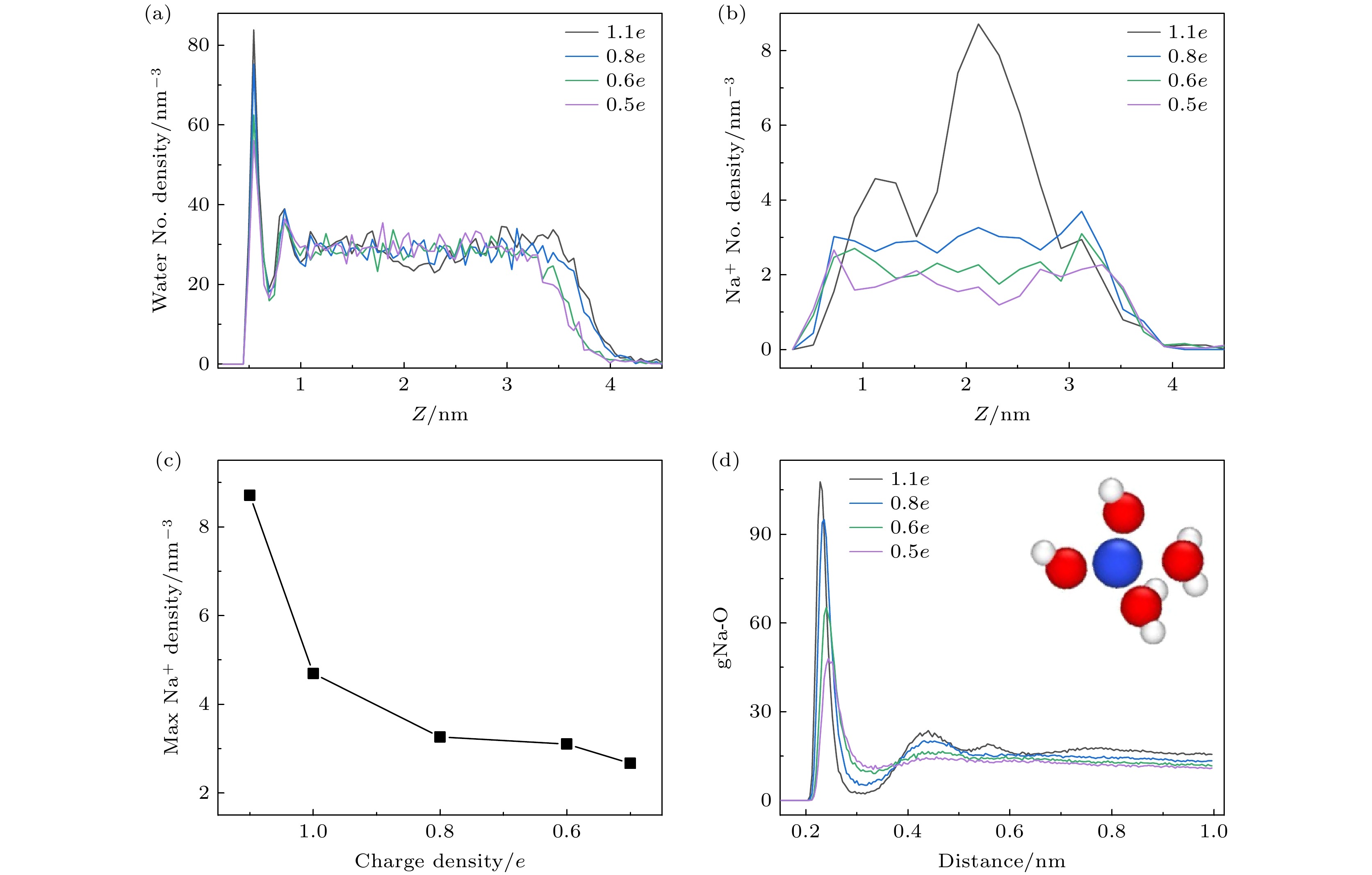 图 4 改变离子电荷密度后, 水分子(a)和钠离子(b)在竖直方向的空间分布, 对于液滴内部的离子而言, 其数密度随着电荷密度的增大而增大; (c) 液滴中离子浓度最大值随钠离子电荷密度的变化; (d) 钠离子-水分子(以氧原子代替)的径向分布函数, 插图为水分子在钠离子周围的分布图