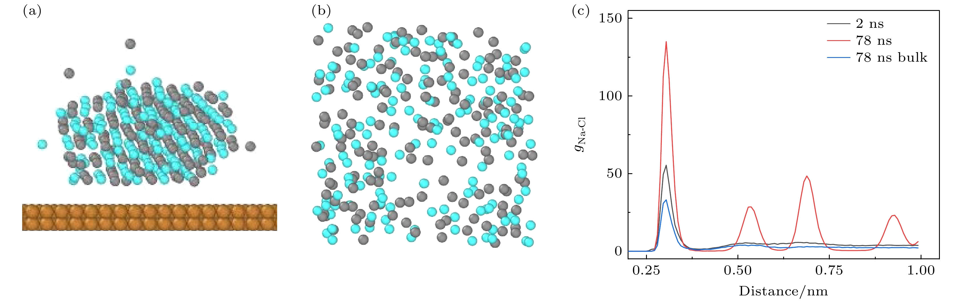 Figure 5. Comparison of the crystallization in the nano-droplet KCl solution on the solid and that in the bulk KCl solution: (a) The side view of ions in the nano-droplet of KCl solution on solid surface; (b) bulk solution with the same concentration of 5.50 mol/kg, the cyan spheres denote potassium ions, the dashed line means the periodic boundary; (c) the RDF of ions in the nano-droplet on solid at 2 ns (black) and 78 ns (red), compared to that in the bulk solution at 78 ns (blue).