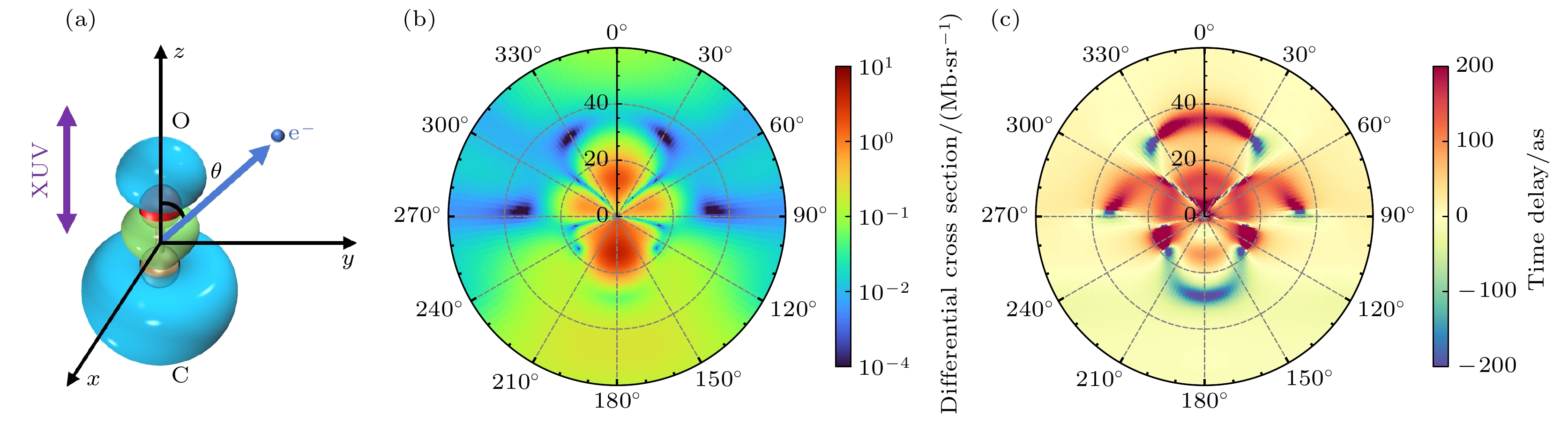 图 1 (a) CO分子5σ轨道光电离示意图, 在偏振方向平行于分子轴的XUV光子作用下, 光电子$ \mathrm{e}^{-} $沿与分子轴(z轴)夹角为θ的方向出射; 在平衡核间距$ R = 1.13 $ Å下$ 5\sigma\to k\sigma $通道的(b)微分光电离截面和(c)微分光电离时间延迟随θ和光电子能量的变化, 其中能量范围为1.5 eV—60 eV