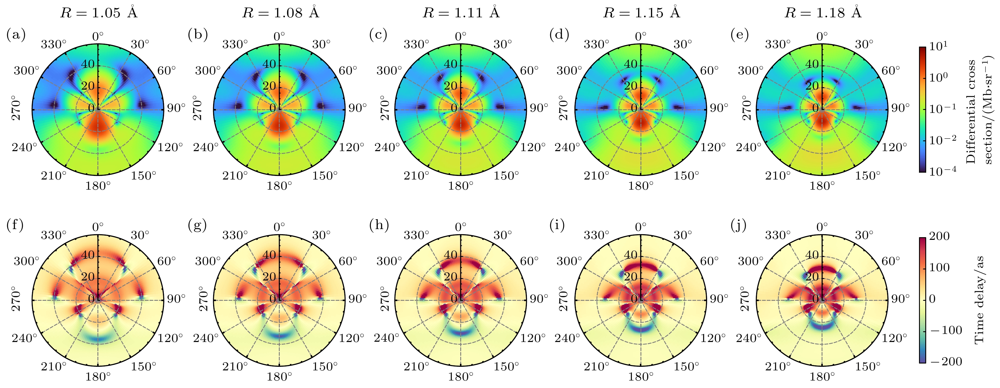 Figure 2. Angle- and energy-resolved differential photoionization cross sections (a-e) and time-delay (f-j) maps of the $ 5\sigma \to k\sigma $ channel in CO at various internuclear distances R = 1.05, 1.08, 1.11, 1.13, 1.15, and 1.18 Å.
