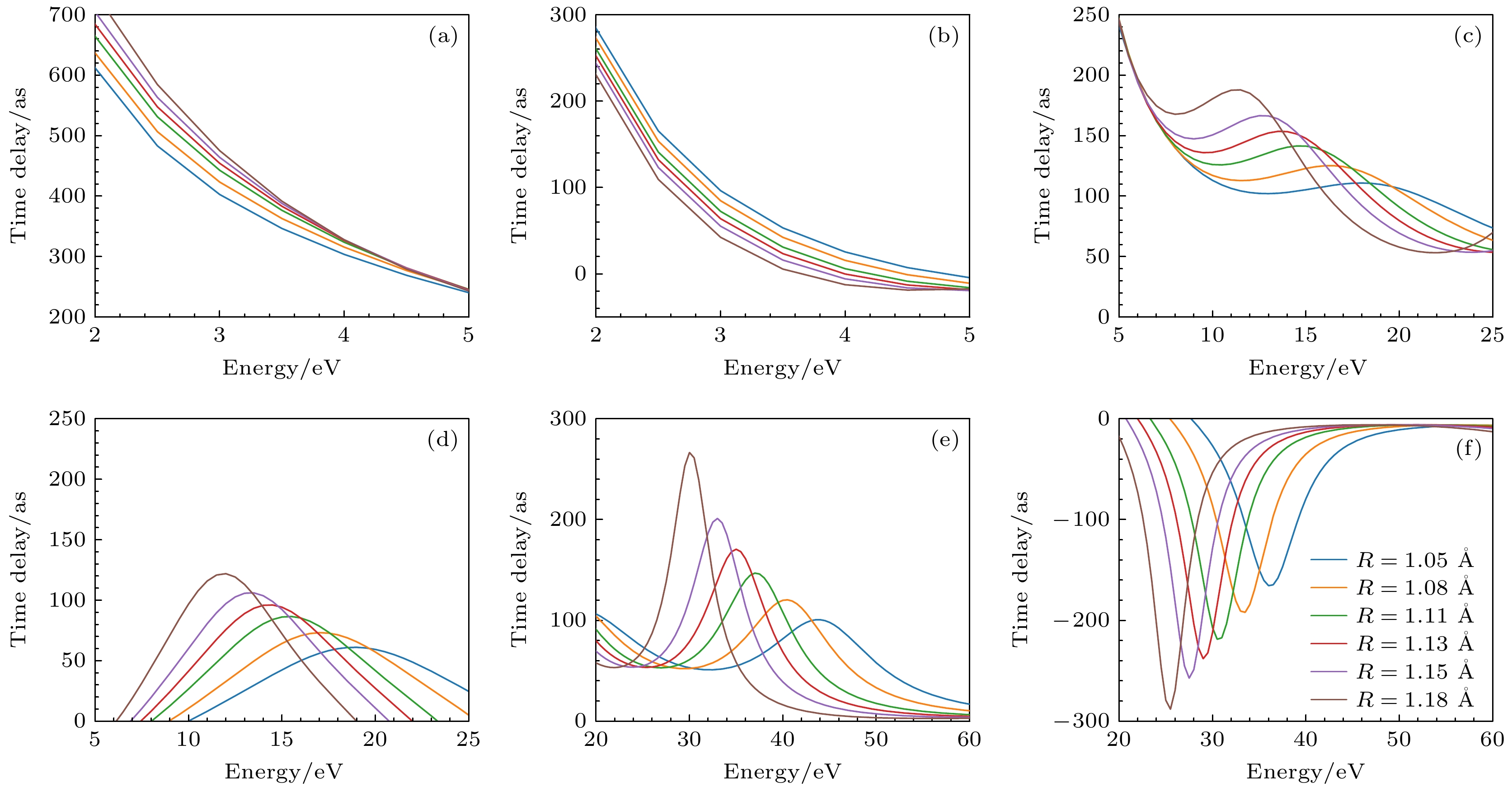 Figure 3. Photoionization time delays of the CO molecule for electron emission along the oxygen and carbon ends in different energy intervals. Each subfigure shows the energy dependence of the time delay at various internuclear distances ($ R = 1.05 $–$ 1.18 $ Å); (a), (c), (e) correspond to low, shape resonance, and high energy ranges with emission along the oxygen end; (b), (d), (f) are for the same energy intervals with emission along the carbon end.