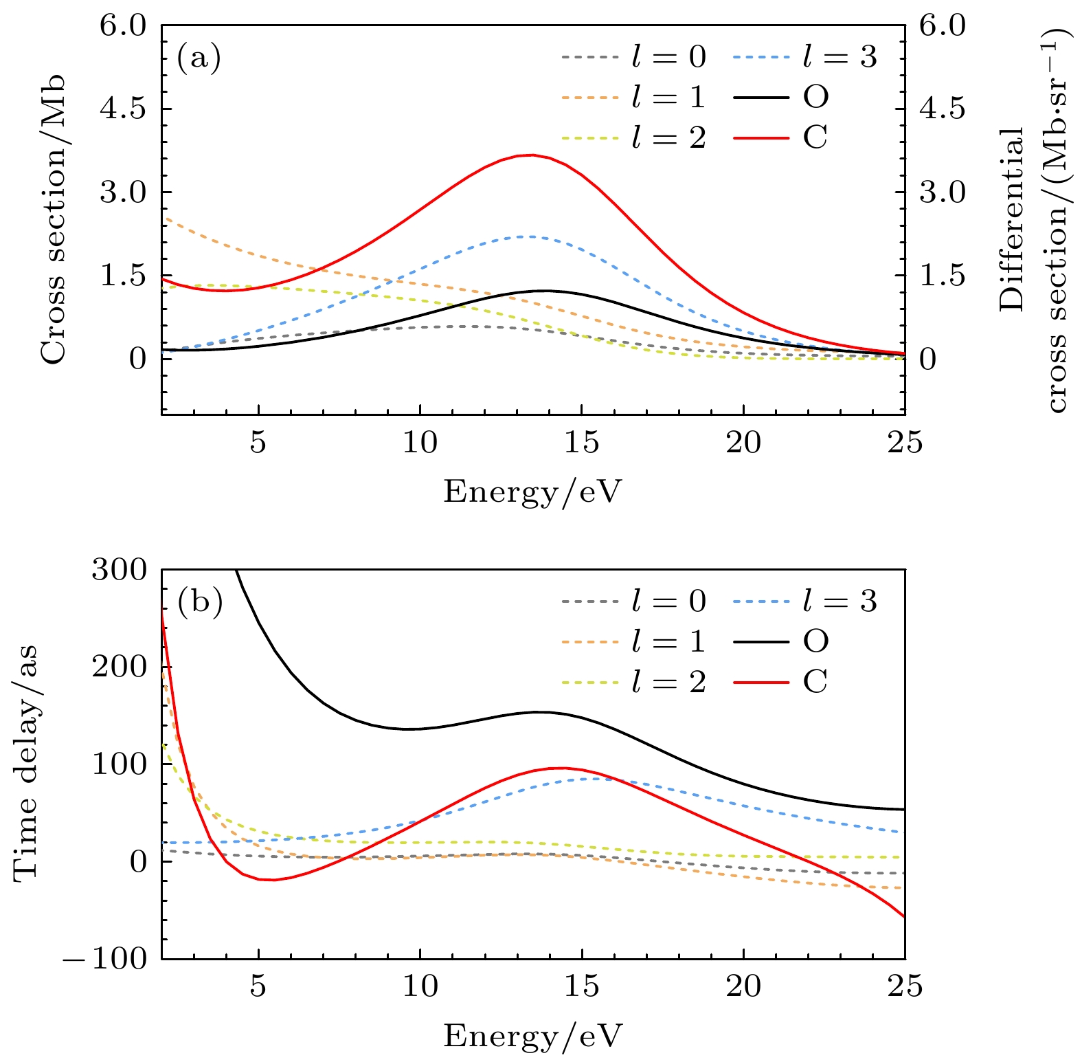 Figure 4. Partial-wave (a) photoionization cross sections and (b) photoionization time delays for the CO molecule at the equilibrium internuclear distance ($ R = 1.13 $ Å), with orbital angular momentum quantum numbers $ l = 0-3 $, as functions of photoelectron energy. In panel (a), the red and black curves correspond to the differential cross sections for photoelectrons emitted along the C and O ends, respectively; in panel (b), the red and black curves correspond to the photoionization time delays for emission along the C and O ends, respectively.