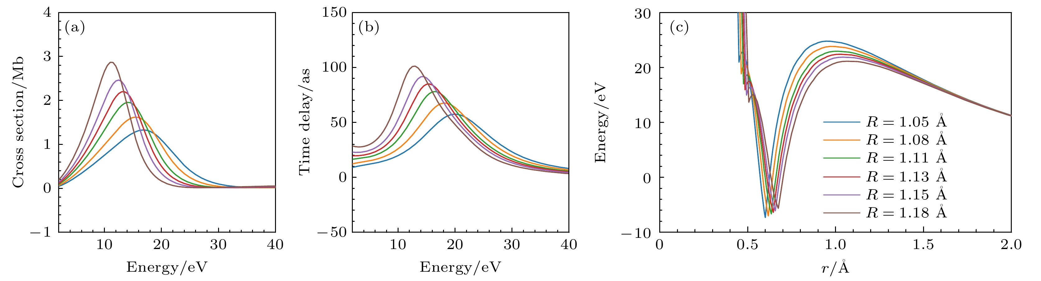 Figure 5. (a) Photoionization cross section and (b) photoionization time delay of the $ l = 3 $ partial wave as functions of photoelectron energy at different internuclear distances; (c) effective potentials composed of the static exchange-correlation model potential and the centrifugal potential for the $ l = 3 $ partial wave, as functions of the radial coordinate r at different internuclear distances.
