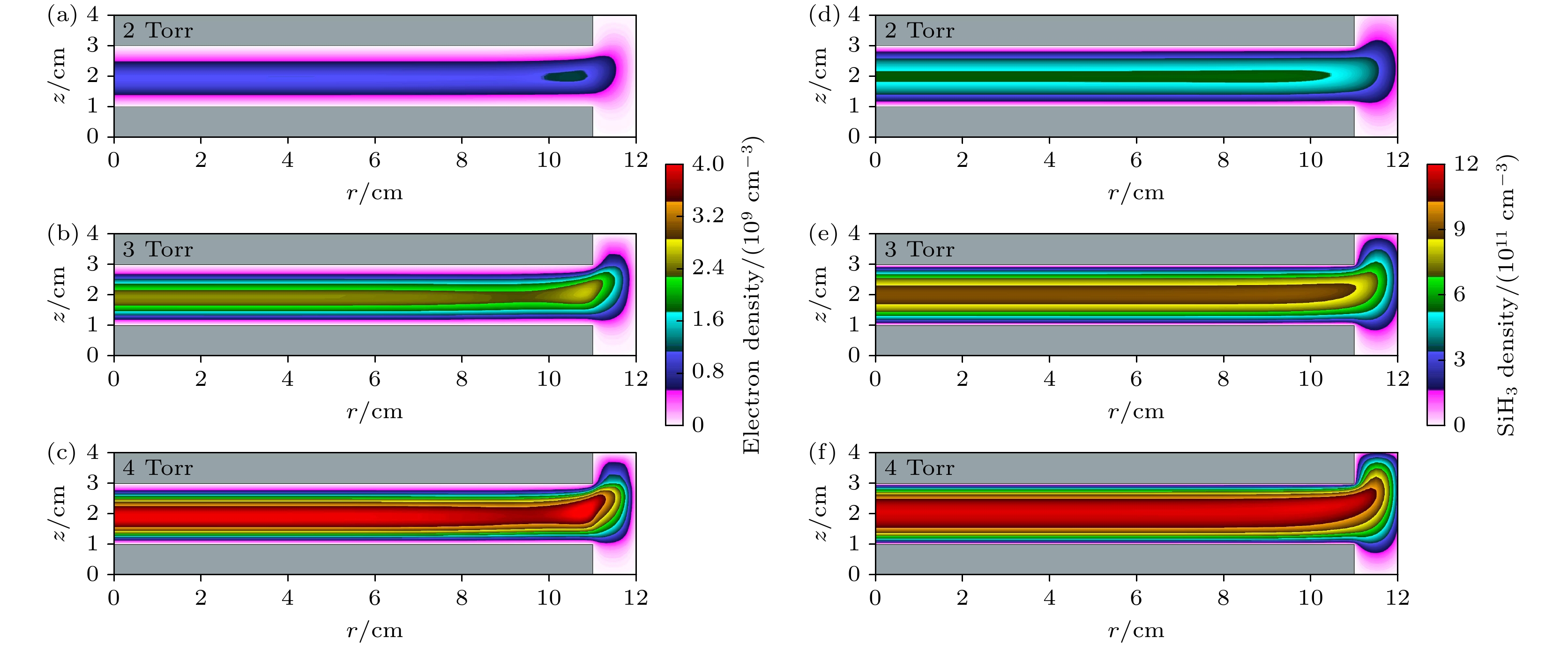 Figure 1. In the discharge of SiH4/H2 at different pressures (2–4 Torr), the discharge conditions are two parallel plates with a length of 11 cm and a distance of 2 cm between them, driving frequency is 13.56 MHz and a voltage amplitude of 50 V, and SiH4/H2 gas ratio is fixed at 1/9: (a)–(c) Period-averaged electron density; (d)–(f) spatial distribution of SiH3 density.